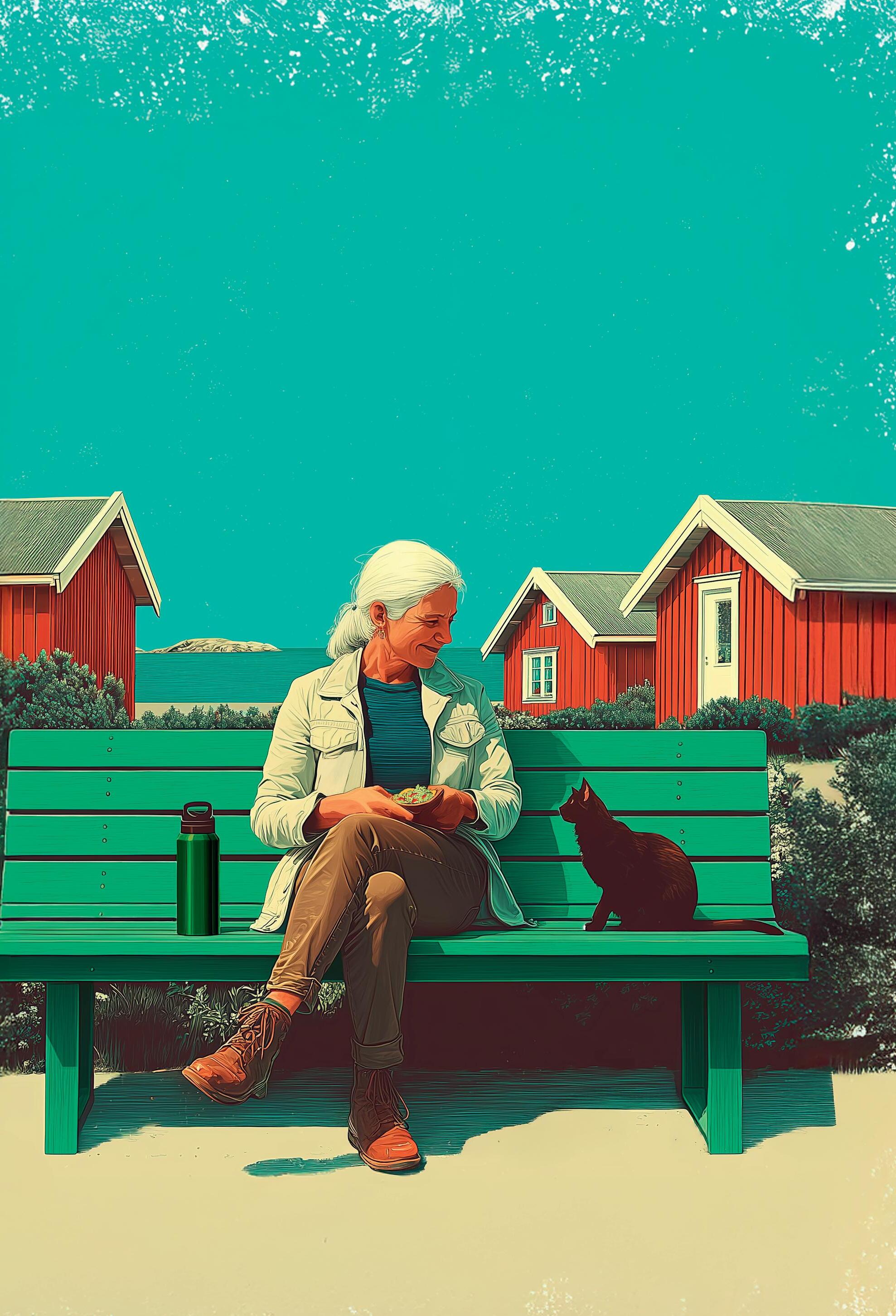 På en promenad möter hon en katt. Den verkar hungrig. Kanske har den lämnats kvar av någon sommargäst.