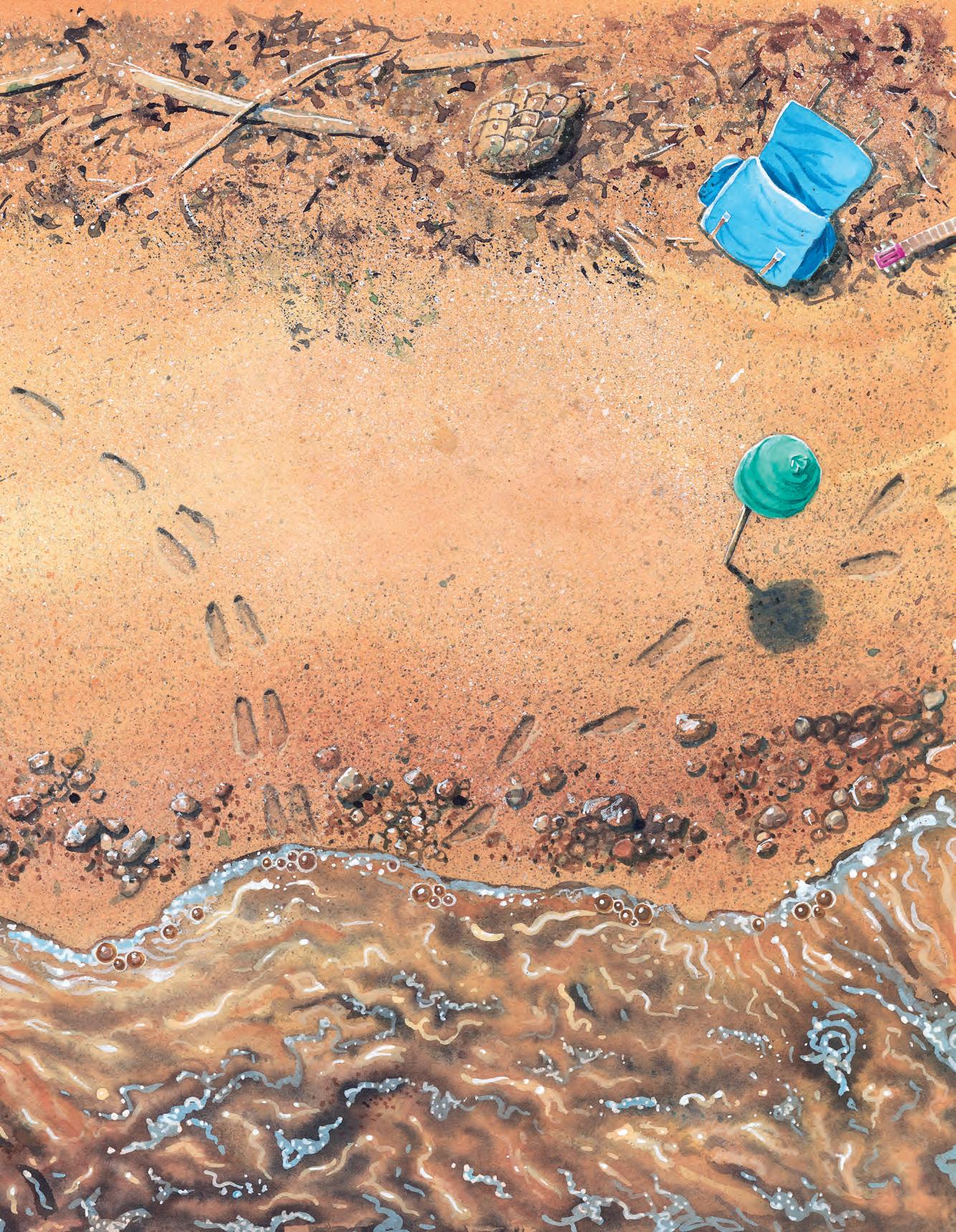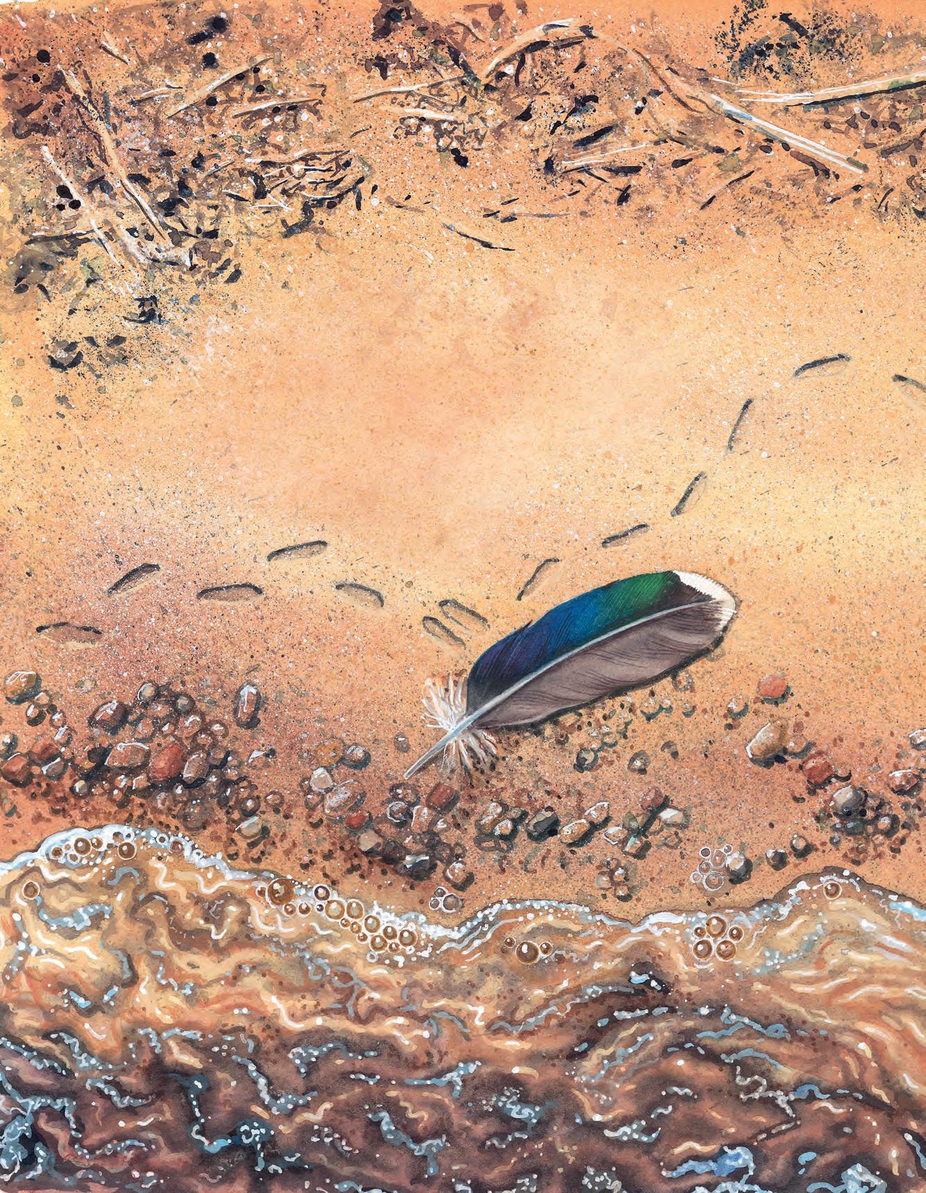 Här har någon promenerat. Mycket små barfotafötter har gjort avtryck i sanden, och stannat vid en fin fjäder.