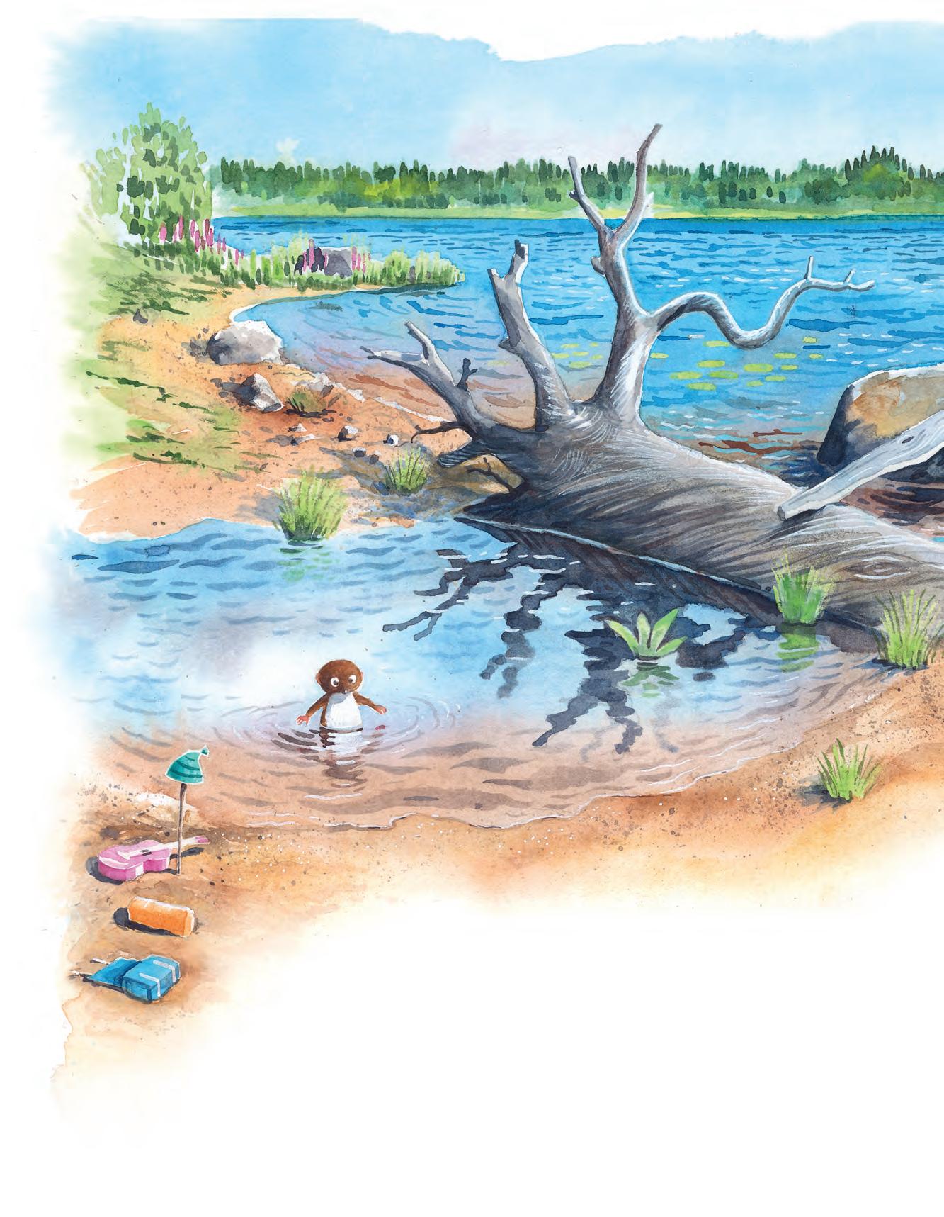 Jo, visst är det Vips som ligger och flyter ute i vattnet. Bara nosen, magen och tårna sticker upp. Det hörs lite skvalp och ljudet av vinden som susar i träden.