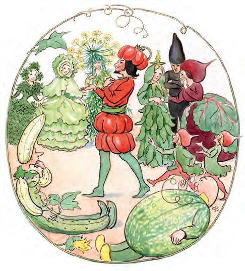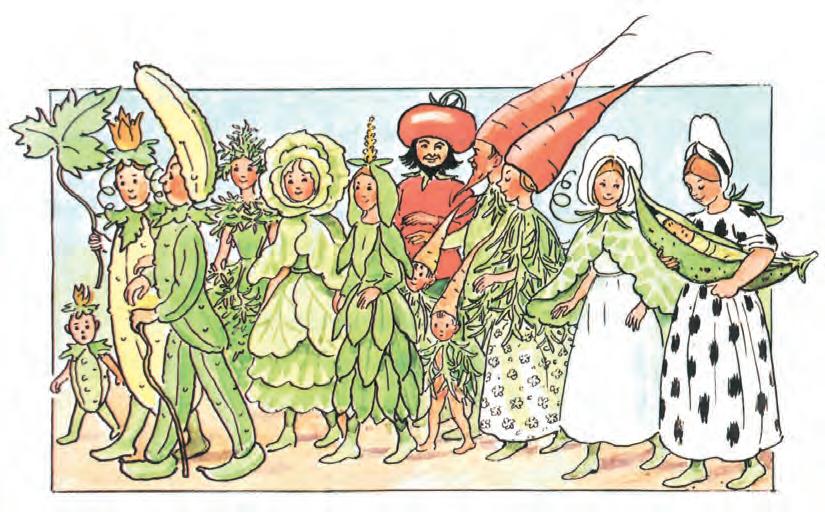 Se dĂ€r kommer ju sjĂ€lvaste herr Gurka med sin fina fru, fröknarna Persilja, Sallat och Spenat och familjen Morot med sin vĂ€n Tomat, lilla fröken Ärta, alltid klĂ€dd i vitt, och fru Böna med det minsta barnet sitt.”