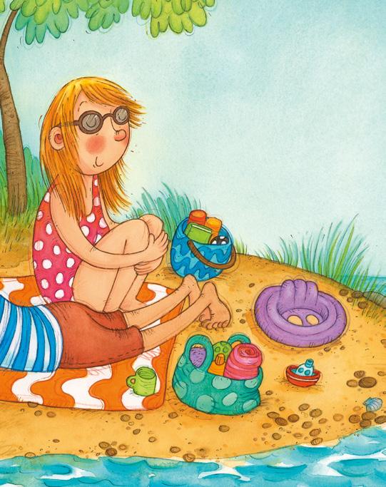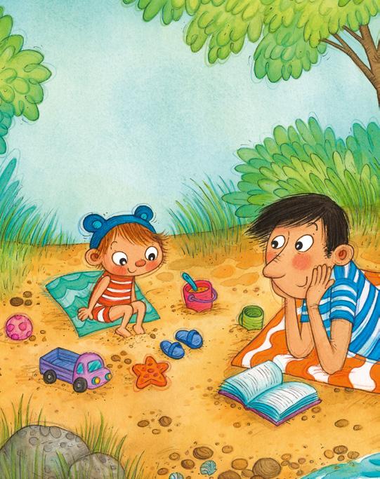 Dam-Dam är med mamma och pappa på stranden. De sitter i skuggan. Tårna i sanden.