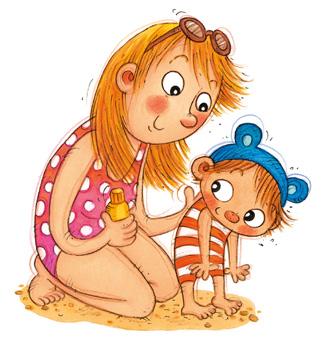 Dam-Dam får solkräm. Smörja armarna, ryggen, benen. Hela kroppen!