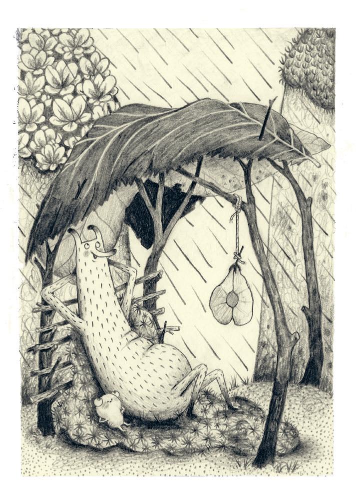 Det regnade och Dim och Lummer hade sökt skydd i sin koja. Där satt de tysta och tittade ut på de växande pölarna. De var lite trötta men också stolta, för precis innan regnet kom hade de fyllt sitt nya vinterförråd med mat.
