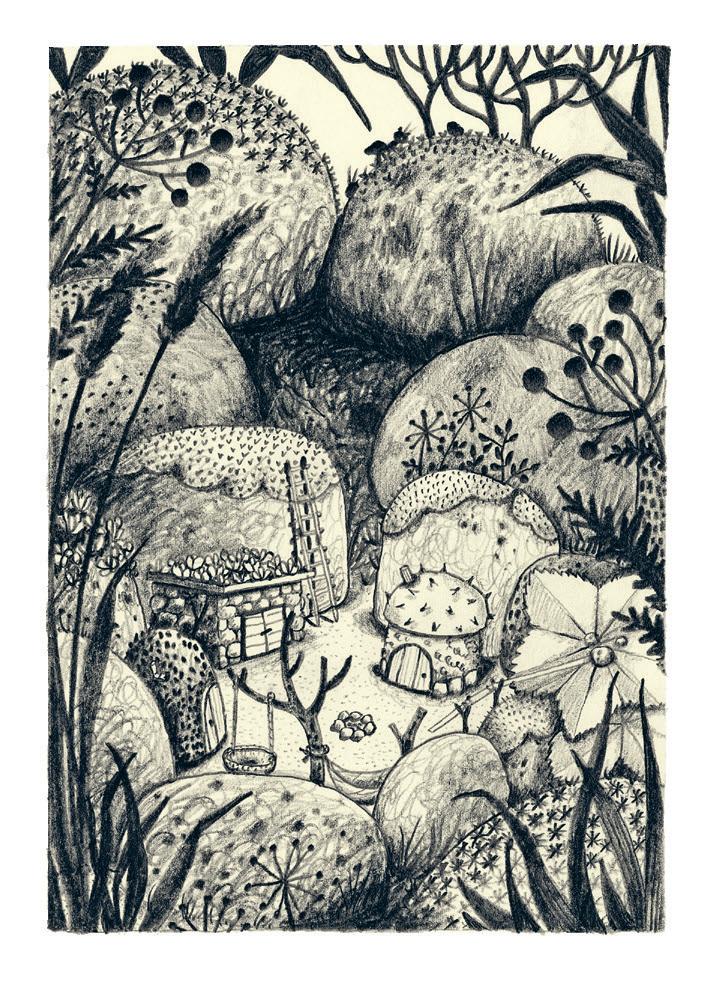han som hade tänkt ut allt de hade på sin gårdsplan bakom stenarna. Kojan, som var enkel men praktisk på sommaren, byggd av enbart kvistar och löv. Badkaret av ett halvt kastanjeskal, med rännor av ihåliga grässtrån som samlade vatten från daggkåpans blad. Stegen av tallbarr som sträckte sig till toppen av den högsta stenen. Rutschkanan, gungan och ett långsmalt löv som fungerade fint som hängmatta.