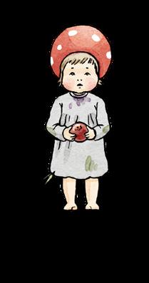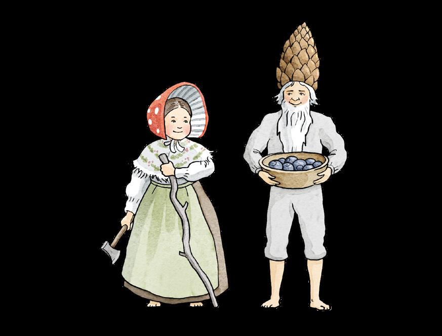 En massa andra bor här i Tomteboskogen också, trädbarnen och blomsterälvorna, fröken Uggla och Glada Grodan med alla sina ungar. Här finns även några man ska akta sig för, som häxflickan Kråkrisa, ormen Zickezack och det hemska Bergatrollet. När de dyker upp är det bra att vi har våra röda mössor, för då kan vi sätta oss ner i mossan och låtsas vara flugsvampar. Ja, vi behöver bara sitta alldeles stilla för att ingen ska upptäcka oss.