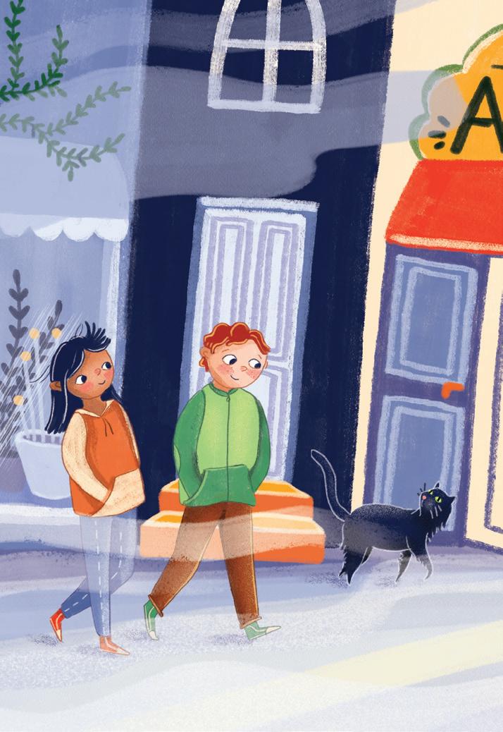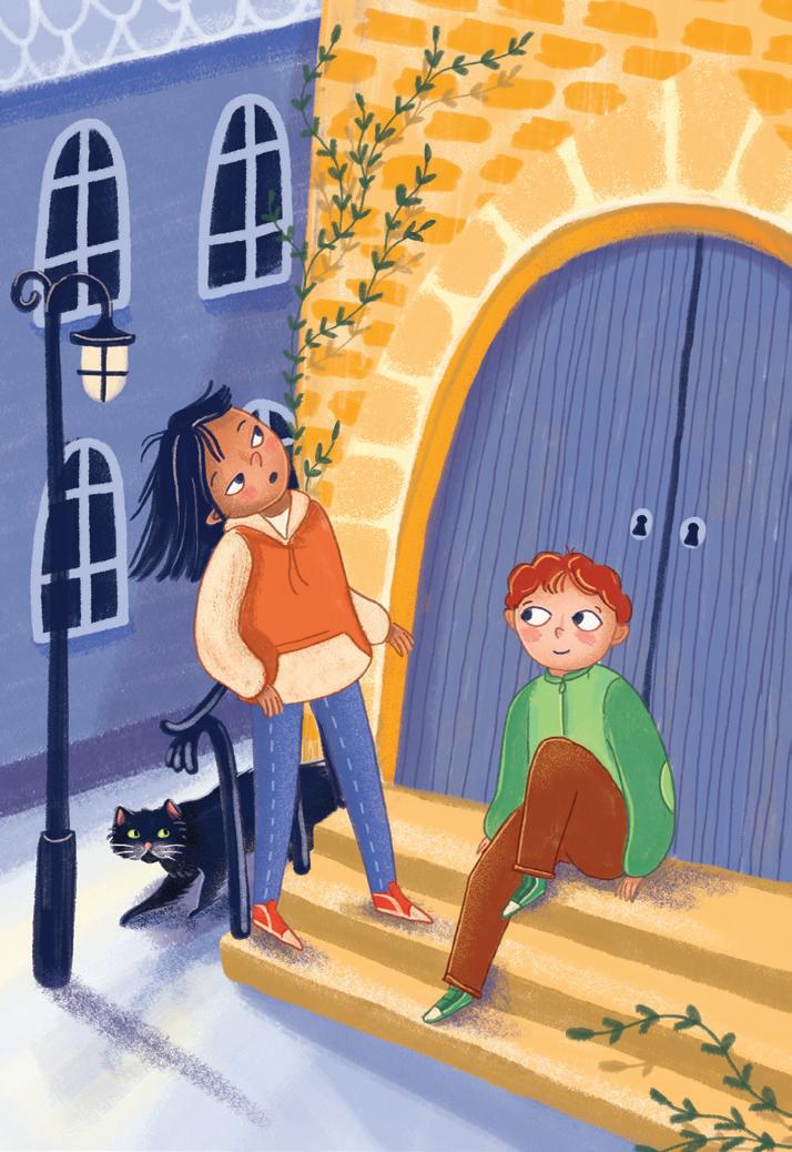 I dag är himlen grå här i Dimmornas gränd. Paloma och jag träffas utanför kyrkporten.