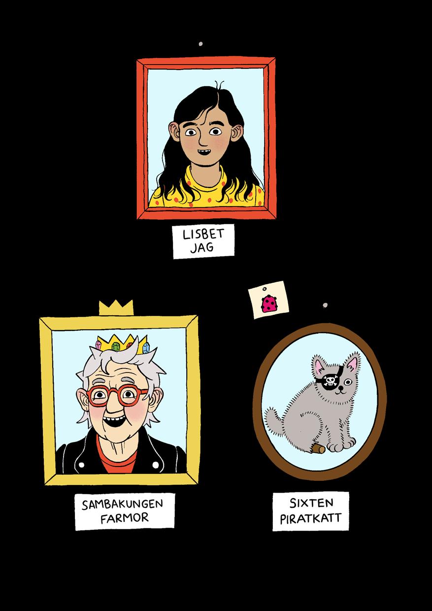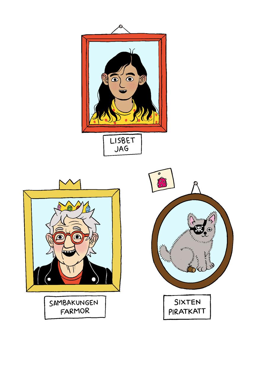 Jag heter Lisbet. Jag bor med min farmor Sambakungen och vår piratkatt Sixten. Mina föräldrar bor på Bahamas. Jag har inte träffat dom sen jag föddes på deras bröllopsresa. Det var på båten till Argentina för sju år sen. Jag går i Päronskolan med min bästis Hanin. Det roligaste jag vet är att rita, helst sånt som inte finns. Farmor är kung över något, fast ingen vet riktigt över vad. Hon älskar geléhallon och att ljuga och fuska och vara bäst. En gång i tiden var hon hemlig agent och reste på massor av spännande uppdrag över hela världen. Nu för tiden är äventyren mest här hemma med mig. Som det här äventyret till exempel!