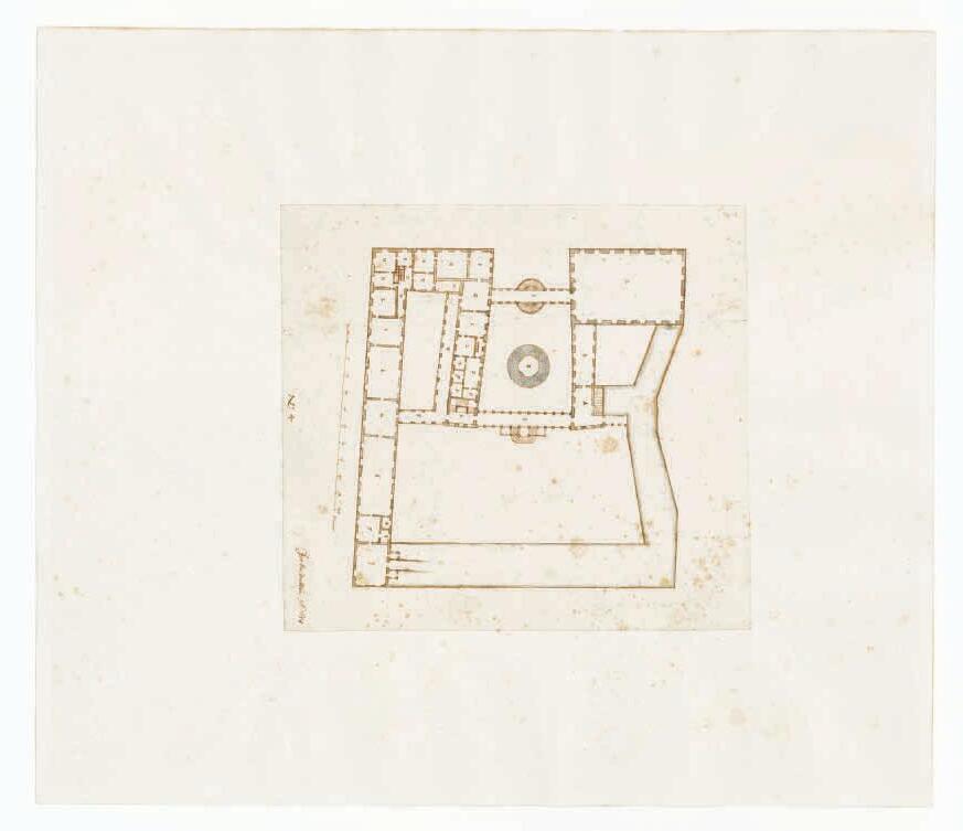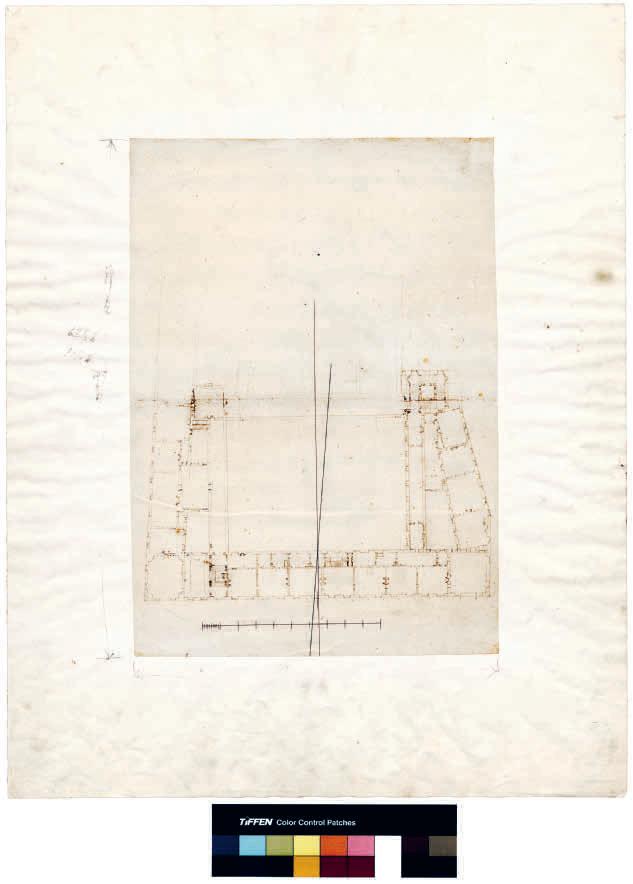 • BILD 5–6. Av två planritningar – den ena en uppmätning av Tre Kronor från 1660 och den andra ett projekt av Tessin omkring 1690 till ombyggnad av längorna kring borggården – framgår några av de problem arkitekten ställdes inför när den gamla oregelbundna slottsanläggningen successivt skulle tvingas in i en klassiserande symmetri. Smala borggårdslängor i öster, söder och väster skulle bland annat underlätta kommunikationen mellan ett planerat stort trapphus i sydväst och kungaparets nya rum i den norra längans översta våning. Den alternativa mittaxeln siktade mot rundtornet och uppenbarade med all tydlighet att detta inte längre kunde tålas. (norr nedåt i båda ritningarna)