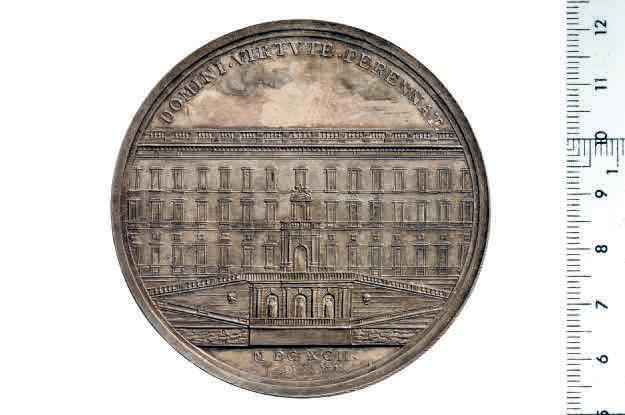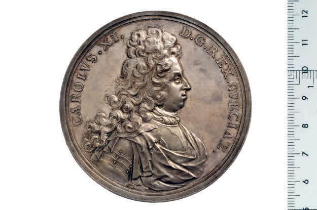 • BILD 1–2. Grundläggningsmedaljen präglades först några år efter det årtal den bär, men hugfäster byggnadsarbetets start 1692 och vad som på Karl XI:s order då skulle verkställas, nämligen påbyggnaden av den gamla slottsanläggningens norra länga.