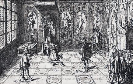 • BILD 4b. Antalet återgivningar av slottsrummen har ökat genom seklerna. Från det gamla slottet finns ytterst få och den äldsta kända framställer Gustav II Adolf i sitt kungsgemak överst i det nordvästra hörntornet år 1616. Samma rum kan märkligt nog idag fungera som konseljsal eftersom tornet byggts in i det nya slottets norra länga. Vävda tapeter markerade de kungliga rummens höga status, liksom de fortfarande gör.