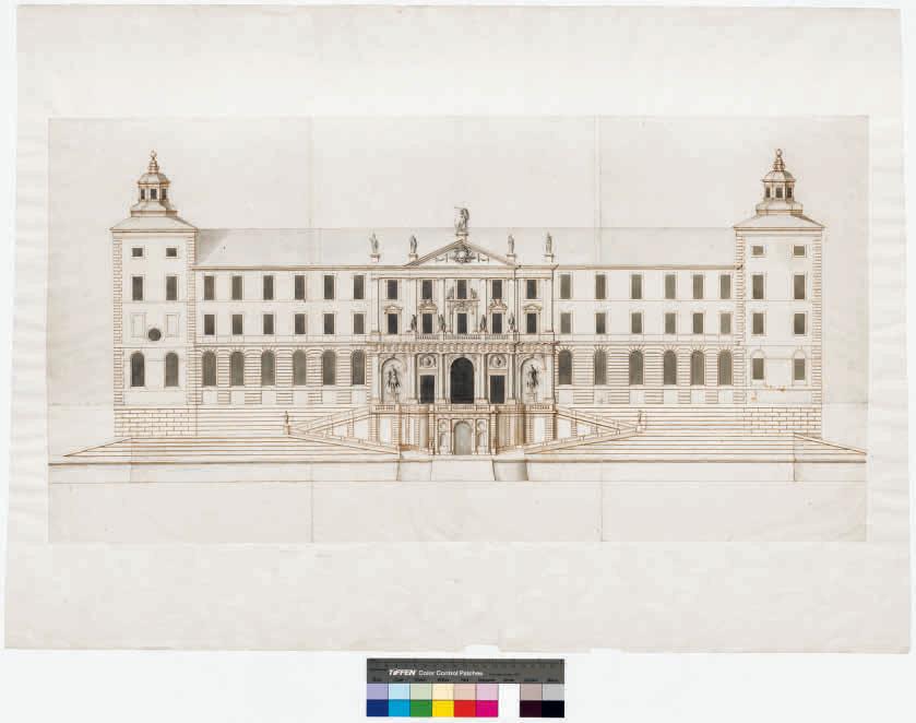 • BILD 8. Nicodemus Tessin d.ä:s klassiserande formspråk hämtades snarast från Holland, inte direkt från Rom. I hans projekt från 1660-talets mitt till den norra längan förmärks detta bland annat genom takets utseende och att de gamla hörntornen tillåtits framträda i fasaden. För bottenvåningens arkadformade karaktär utgick arkitekten från de höga fönstren i Johan III:s slottskyrka.