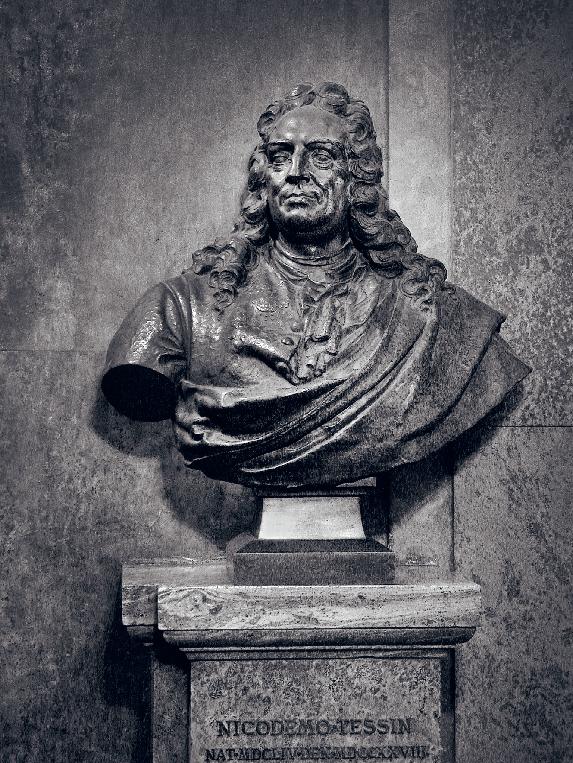 • BILD 3. På Oskar II:s uppdrag utförde skulptören John Börjeson 1886 en byst av slottsarkitekten i idealiserande barockstil. Den placerades i nedre delen av kungens stora trappa och fick kort därefter sällskap av en sittande Moder Svea, vars förebild hämtats från en av Tessins stora slottsritningar.