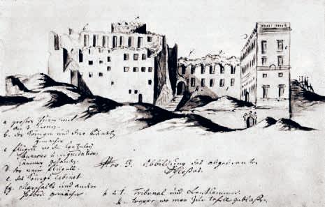 • BILD 10. Den gamla slottsanläggningens undergång beseglades genom ett kungligt beslut redan 1692. Den katastrofala branden den 7 maj 1697 påskyndade endast processen. En samtida teckning visar förenklat hur den påbyggda norra längans murar blivit stående intakta medan de äldre delarna i högslottet mer eller mindre förstörts. En successiv ombyggnad var inte längre möjlig.