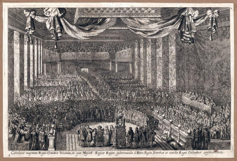 • BILD 14. Med Karl XI:s trontillträde 1672 bereddes vägen mot kungligt envälde och en ensamt beslutande i ombyggnadsfrågorna. Ceremonin ägde rum i rikssalen, som dekorerats med bland annat vävda tapeter, en serie särskilt stora tapeter som gick under beteckningen rikssalstapeterna. Dessa veks runt murpelarna mellan salens fönster, en ordning som vittnade om att de klassiserande idealen inte vunnit tillräckligt fäste i landet. Den uppgiften tog Tessin på sig.