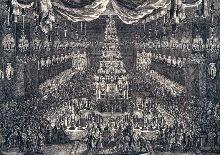 • BILD 9. Festmåltiden i det gamla slottets rikssal i samband med Karl XI:s trontillträde 1672 förhöjdes med hjälp av stora bufféer med rika uppsättningar av vinkannor och fat i ädla material. Den största buffén stod framför bordet där kungen och hans mor, änkedrottning Hedvig Eleonora, tagit plats. Dess storlek och prakt skulle illustrera den ymnighet som landet i och med trontillträdet gick till mötes.