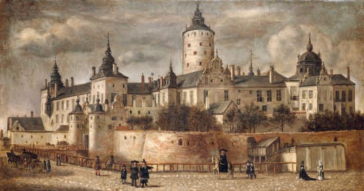 • BILD 7. Konstnären Govert Camphuysens utsikt från sydväst, utförd 1661, ger en ökad närhet till det gamla slottets rikt sammansatta exteriör. Denna vittnar om de successiva utbyggnaderna, som motiverats av ökade krav på försvarsförmåga, utrymmen och skönhet.