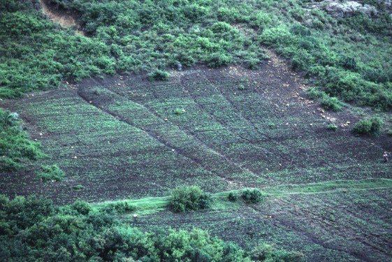 Figure 2. Growinga maizecropwithout conservation measures on slopes that are toosteep in Lesotho. Rills andgullieshave appeared earlyinthe season. (PhotoJ Åkerman)