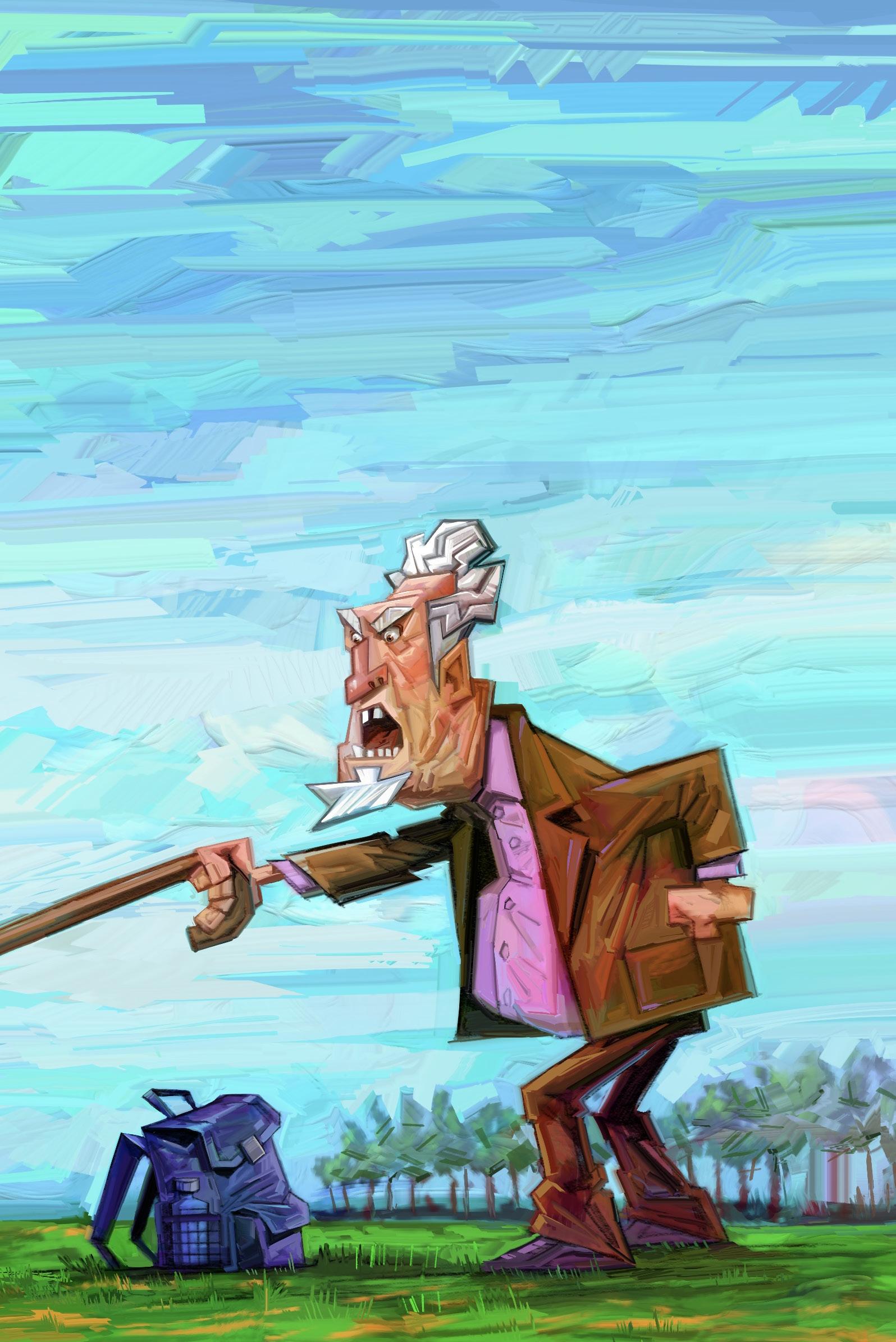 är otäckt när gubben viftar med käppen framför honom och vänder sig bort för att skydda ungen.