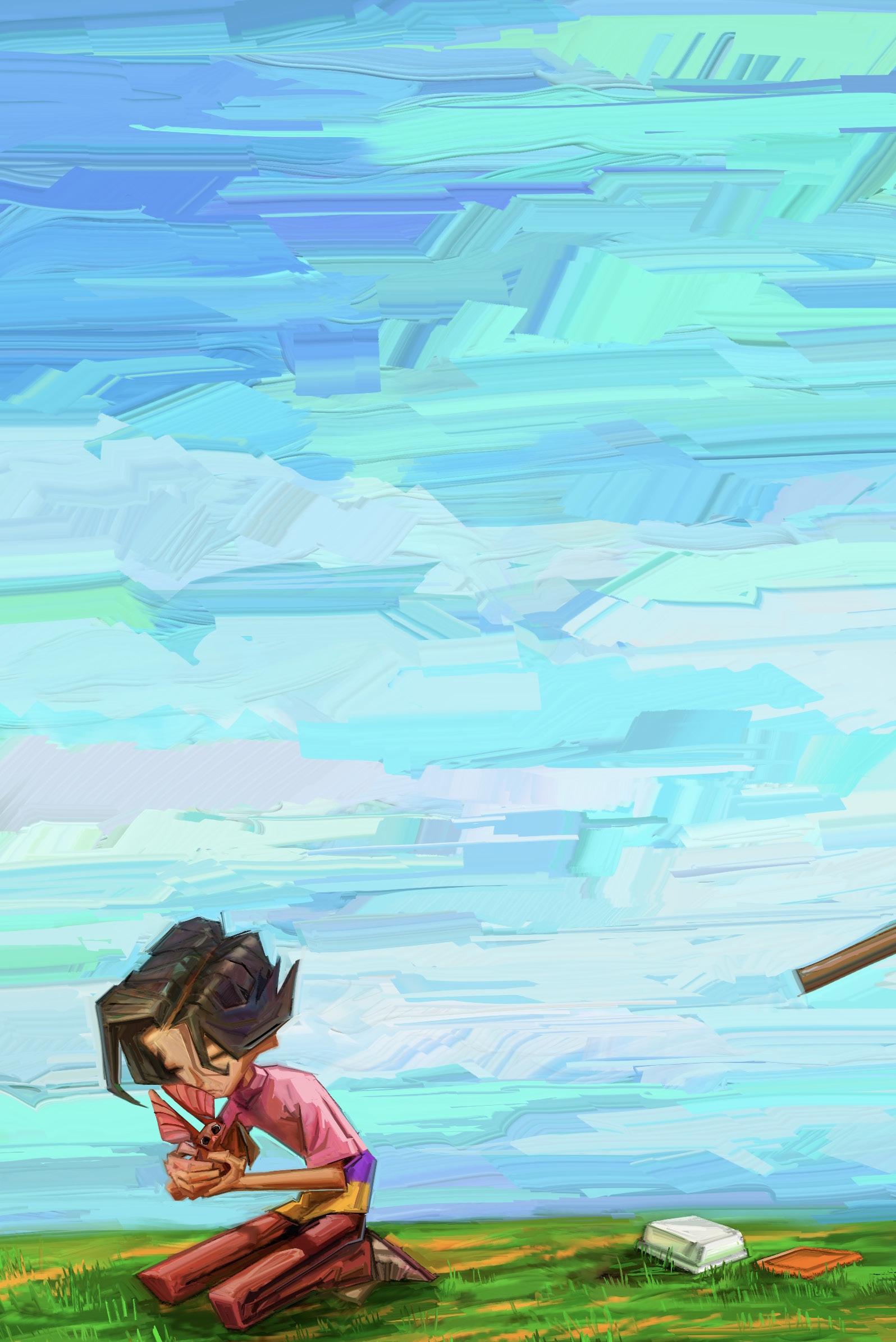 Försiktigt lyfter han upp fladdermusungen med näsduken och lägger den på gräsmadrassen. Den lilla fladdermusen gömmer kroppen i sina vingar och försöker bita Malte med sina vassa tänder.