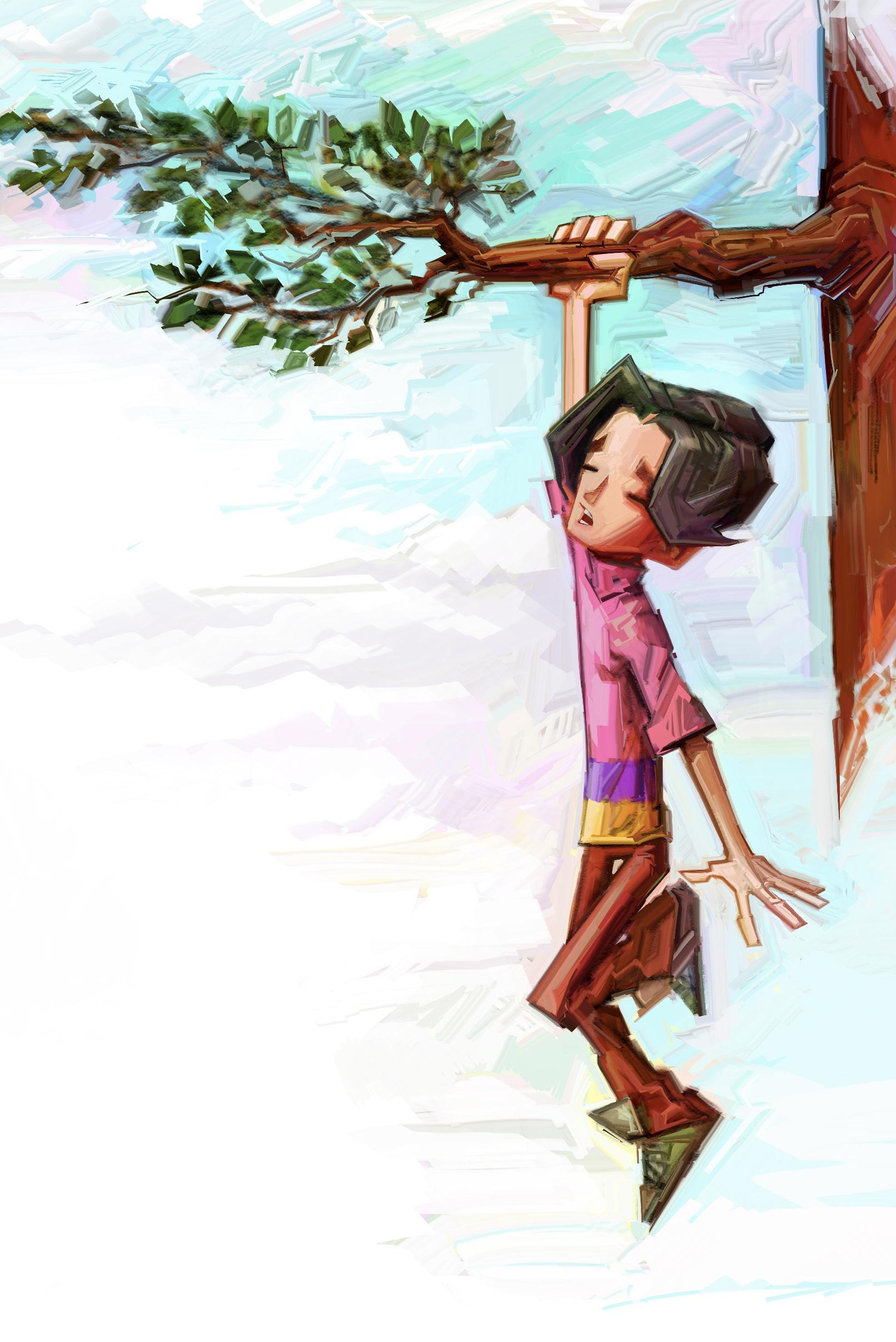 Han landar på magen med ett ben på vardera sida om grenen. Han klamrar sig fast med både armar och ben. Hjärtat slår snabbt och rädslan kryper i nacken. Det är flera meter ner till marken. Han kunde lika gärna slagit ihjäl sig.