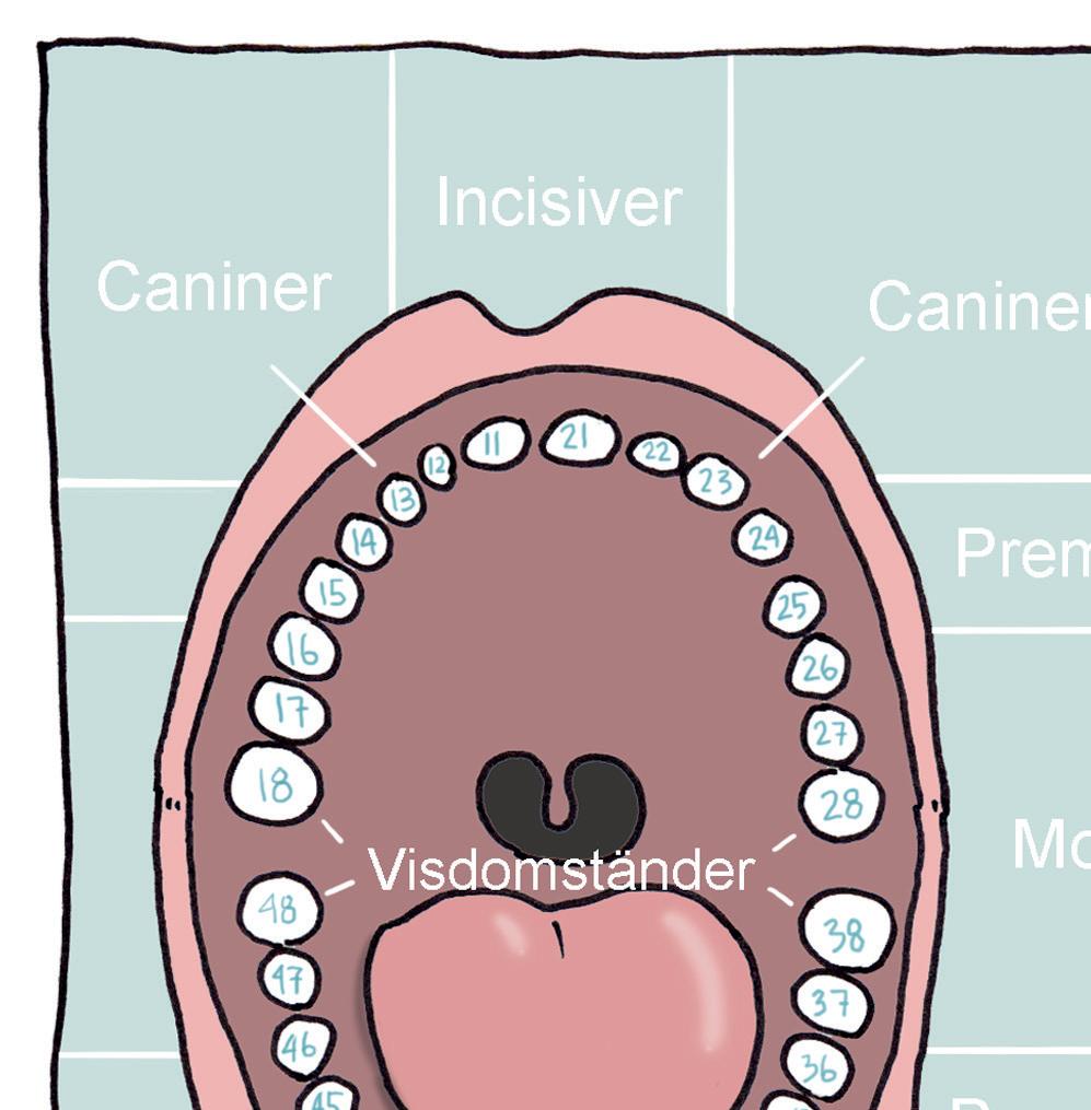 På väggen sitter en stor affisch som visar en mun, där står det att alla tänder i munnen har namn och nummer.