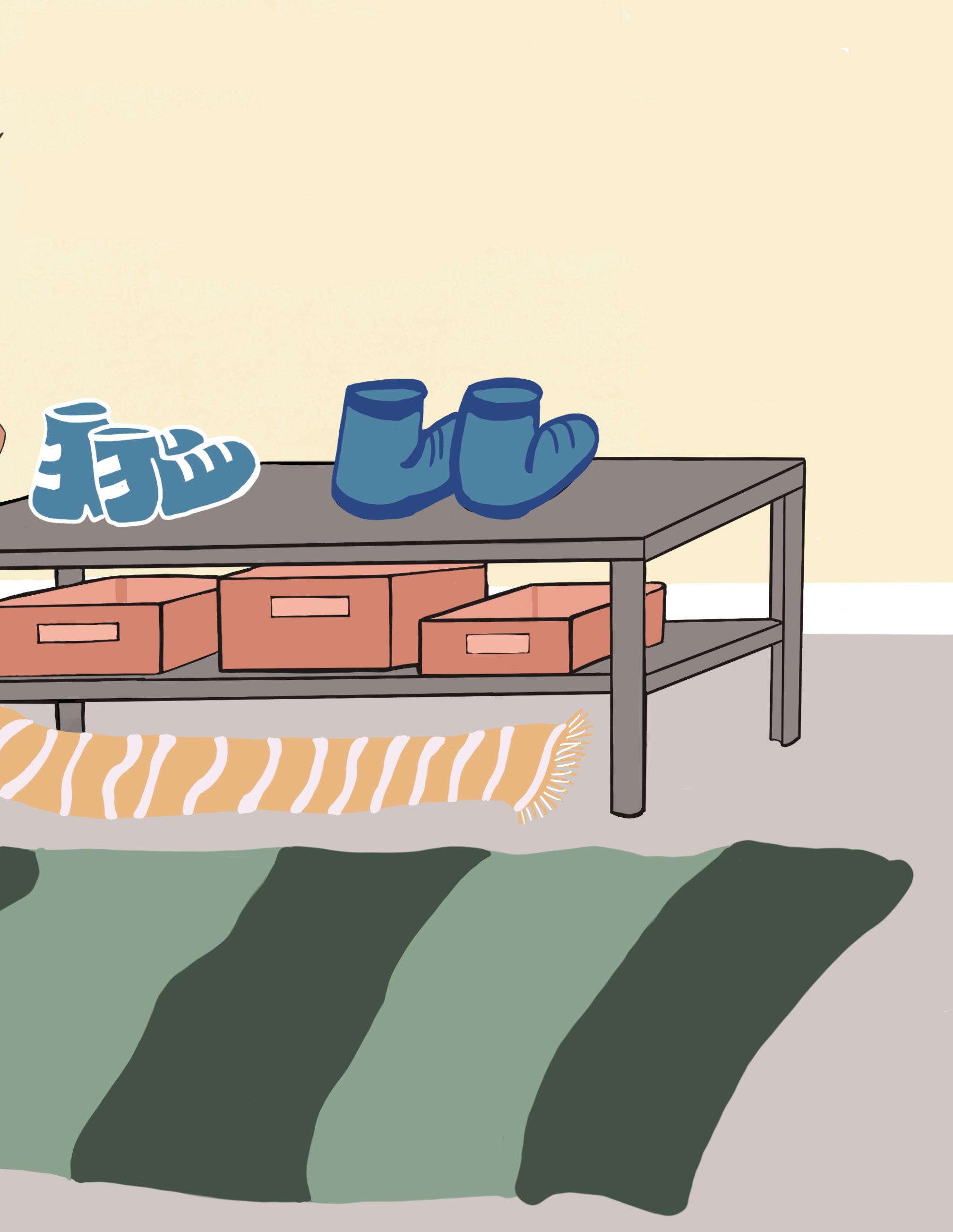 De ropar hejdå till mamma som byter blöja på deras lillasyster.