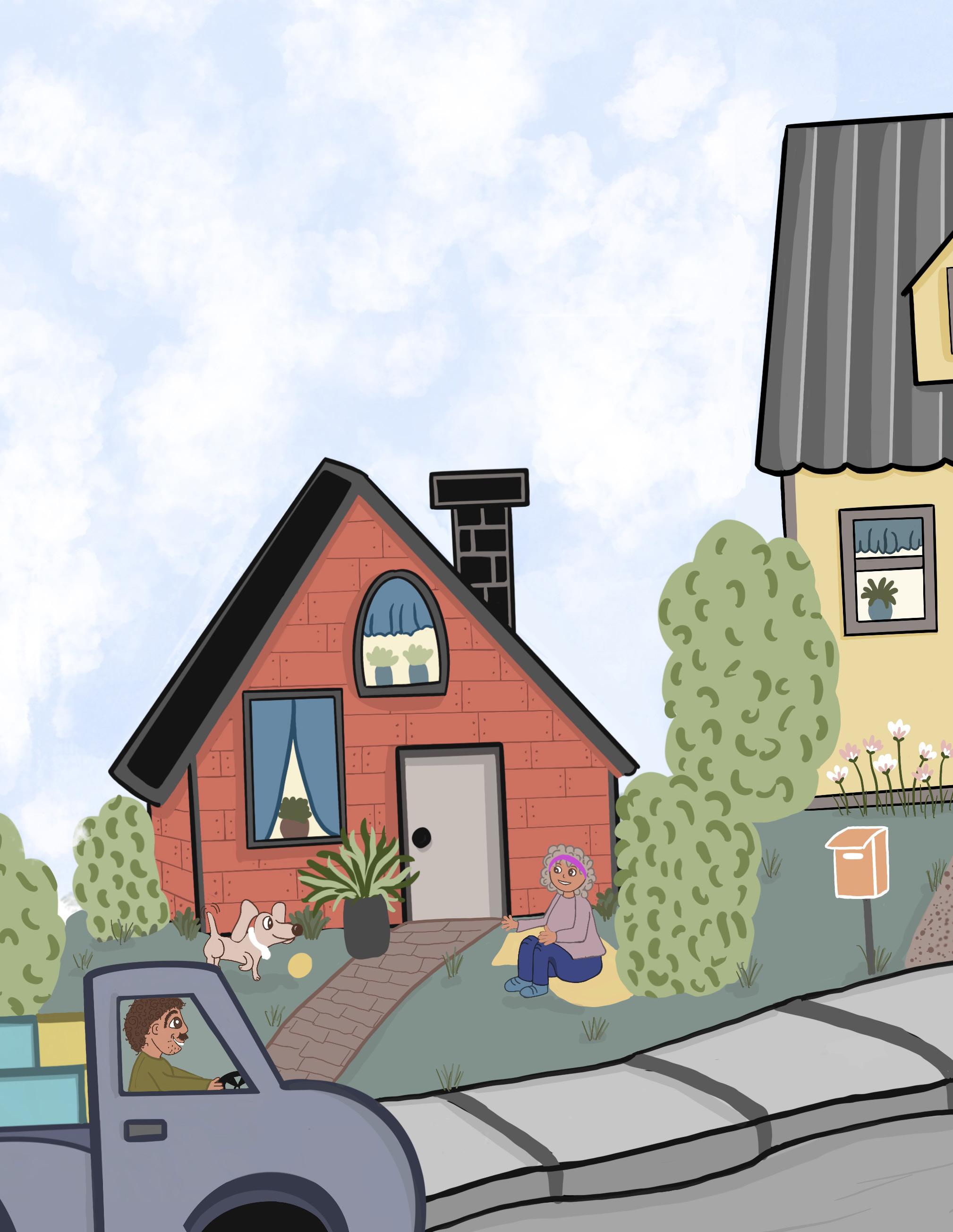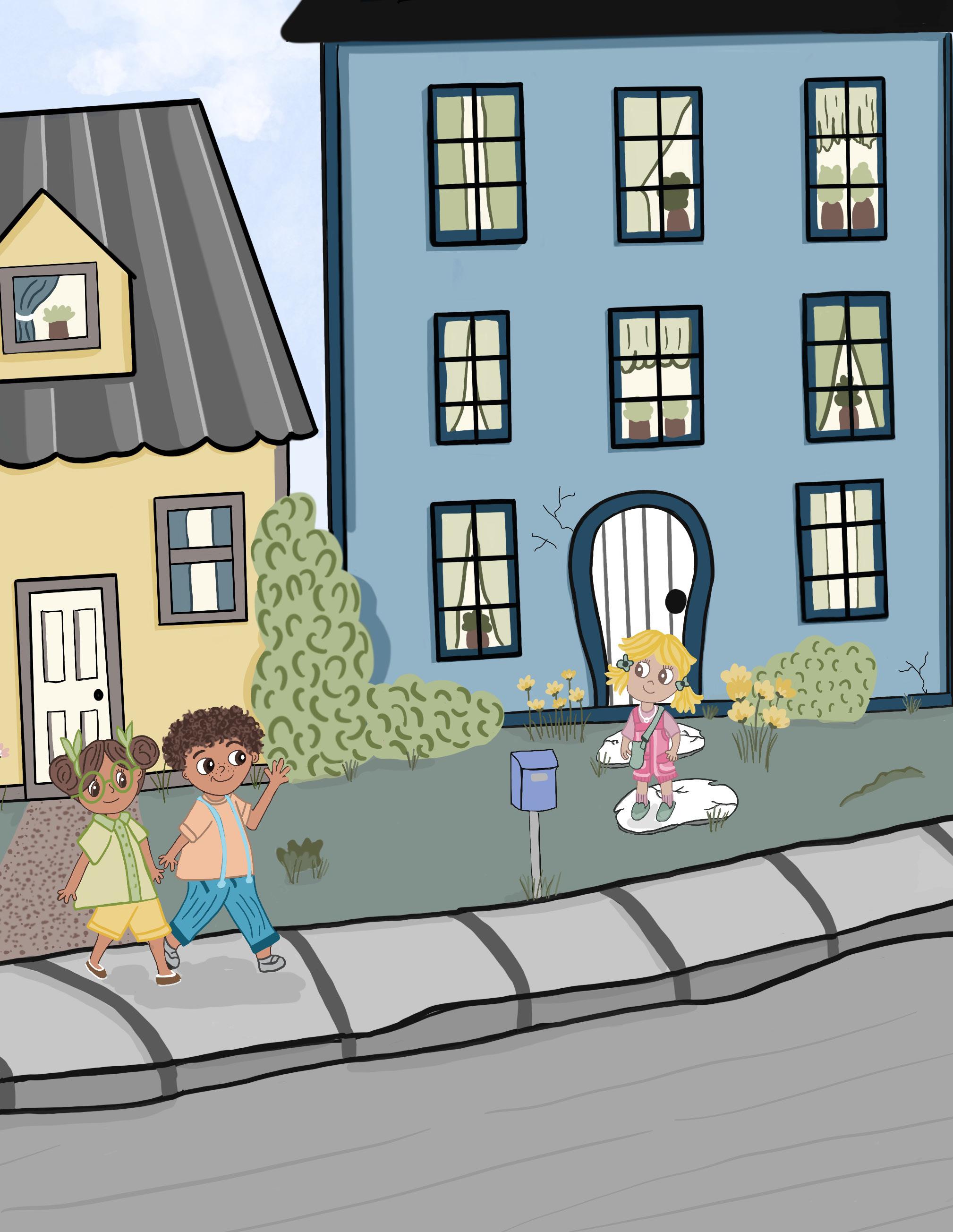 Ute skiner solen och de vinkar till Mollie som bor i huset bredvid.