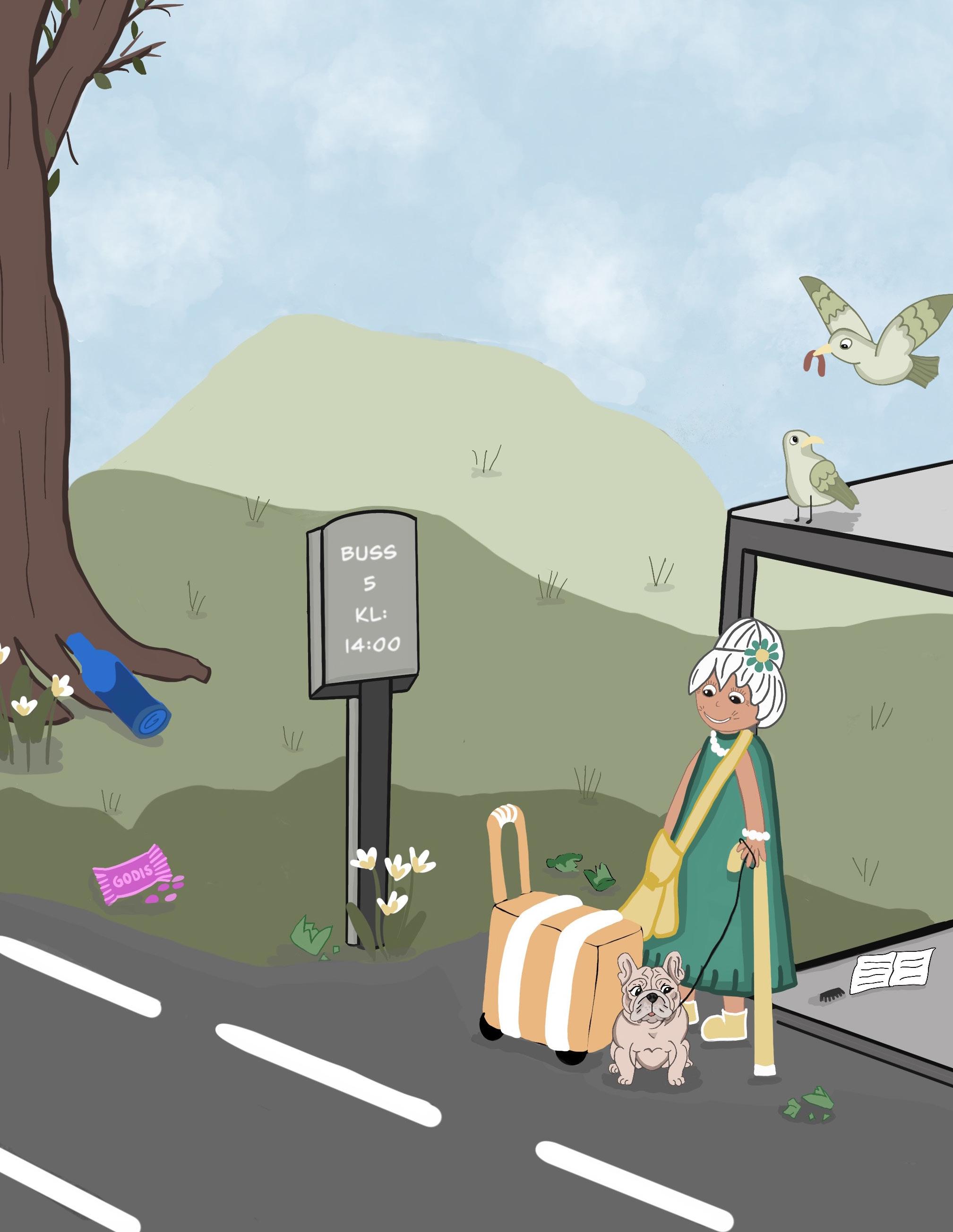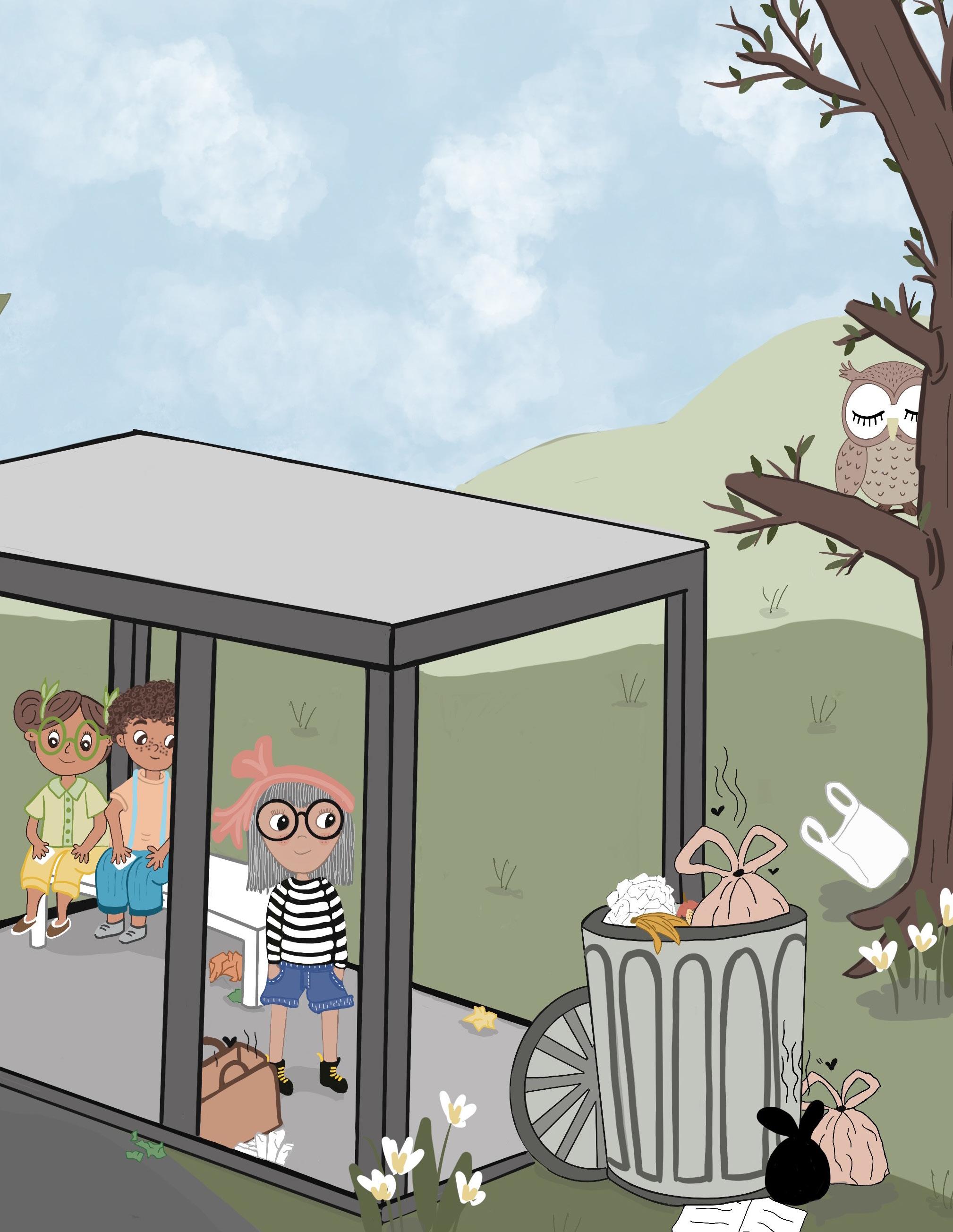 När bussen äntligen kommer har de hjälpts åt att slänga skräpet i soptunnan.