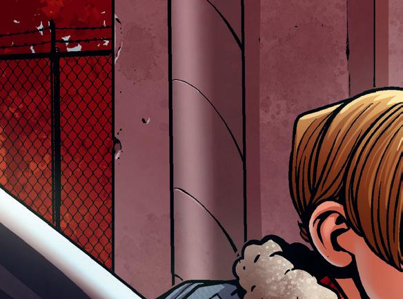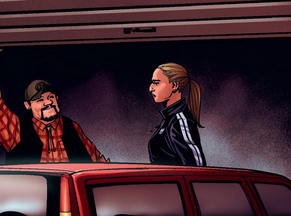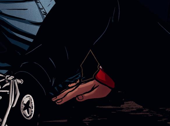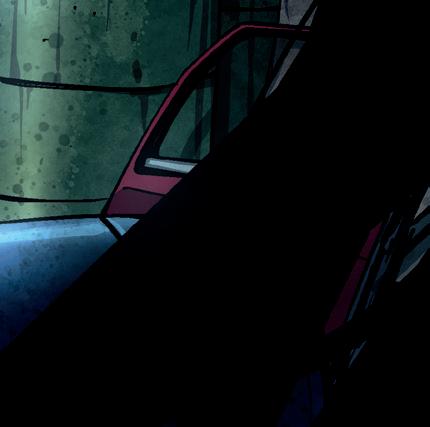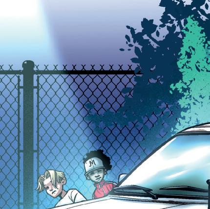 Mika och Nico gömmer sig bakom en bil vid garaget, lite skymning