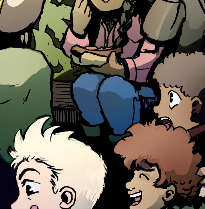 Skogsrået, läser läraren. Hon hade räv-svans och hennes rygg såg ut som ett ihåligt träd. Om man sa sitt namn till henne blev man fast i skogen för alltid.