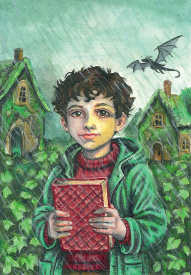 Teddy, hisdad,heldout alarge tomato,bubblinginhis hand. Fabian burned hisfingers andquickly droppeditinto hisschoolbag.Hepackedhis spellbook,his quilland his inkpot.Thenheglanced outofthe window.