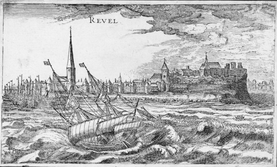 Revalfrånhavet.I förgrunden närmar sigett segelfartyg hamnen (längstt.v.).Närahamnenreser sigS:t Olofskyrkans höga tornspira. MellanS:t Olofsoch S:tNicolai kyrkor sesendel av stadsmuren medflera försvarstorn.PåDomberget (t.h.) återges Domkyrkanoch Revals slottmed dess höga torn.Gravyr 1615.