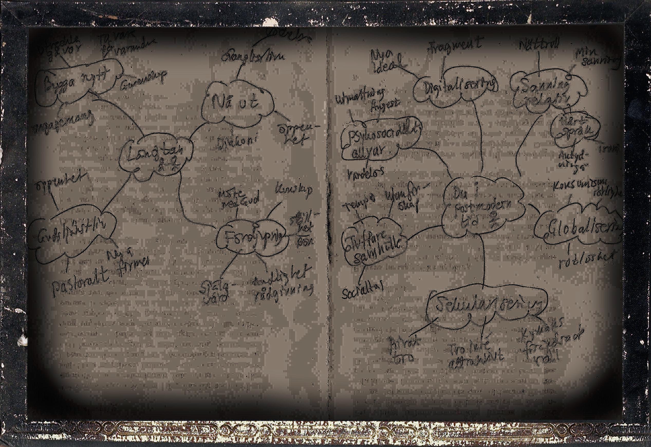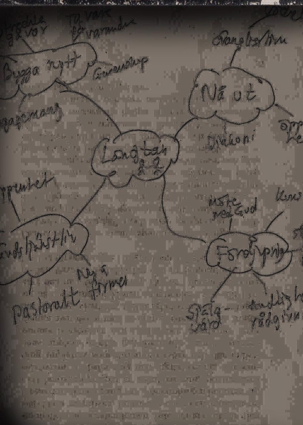 Till slut hade jagskrivit tremindmaps. Denförsta handlade om det sompåverkarförsamlingenutifrån. Denandra om det inre landskapet,livet därinne. Den tredje blev en slagsanalys av människorslängtan,det somuttrycksi samtal,i frågor,i tystnad. Närallt detta fanns nedtecknat lätjag detvila.