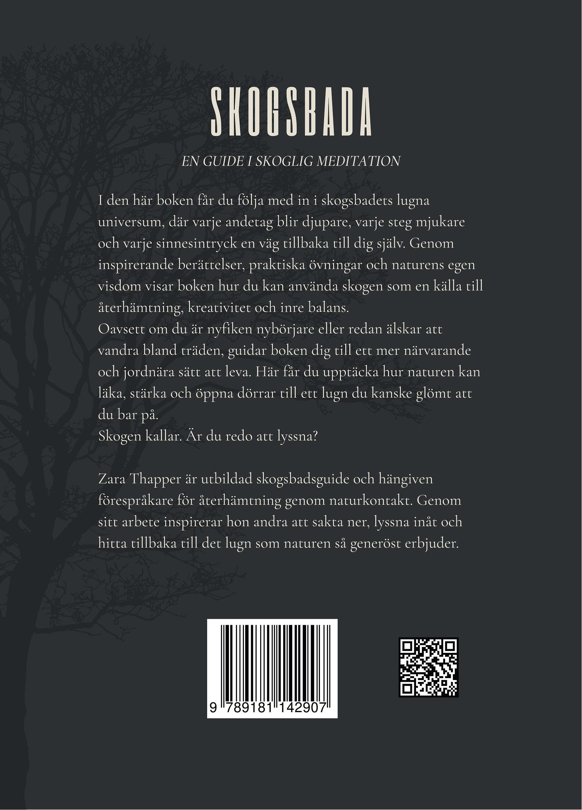 Hej, Zara heterjag.Skogenhar alltid varitenviktigdel av mitt liv— inte somenplats jagbesöker ibland, utan somett landskap jagvuxit upp tillsammans med. Mina tidigaste minnen doftar av fuktig mossa, rökfrån lägereldar ochden därspeciella stillheten sombarafinns mellan trädstammarna. Sombarnlärde jagmig knytaknoparpåscoutläger, som tonåring somnadejag itälttillljudetavvindsom drog genomgranarna, ochsom vuxenhar jagfortsattatt söka migut— medhundenvid min sida ellerfrånhästryggenlängs slingrande skogsstigar. Skogen harföljt miggenom livets olikaskeden. Denhar varitmin lekplats,min träningsplats, minfristad ochmin lärare.I perioder närlivet gått fort harden hjälpt migatt saktaner.När tankarna snurrathar den gett migklarhet.När jagbehövtkraft harden påmint migomatt allt i naturenrör sigi sinegentakt— ochatt jagockså fårgöradet. Detvar därför skogsbad komatt blimer än ettintresseför mig. Detblev ettsättatt återknytatillnågot jagegentligenalltidvetat:att natureninte bara är vacker atttitta på,utanläkande attvarai.Att närvarointeär någotman presterar, utan någotsom uppstårnär manger sigsjälv tidatt landa. Ochatt skogen,med sintystnad ochsinarytmer, är en av de bästa platsernaatt göra just det. Ibörjanav2026fickjag ocksåmin certifiering somSylvotherapypractitioner. Denhär bokenärmin berättelse,men ocksåeninbjudan. En inbjudan attsakta ner, attlyssna, attkänna —och attupptäckavad somhändernär vi låterskogenbli en delavvårt välmående. Jaghoppasatt mina erfarenheter,min nyfikenhet ochmin kärlek tillnaturen kaninspirera digatt hittadin egen vägini skogens lugn ochtillåta detatt läka detsom behöverläkas.