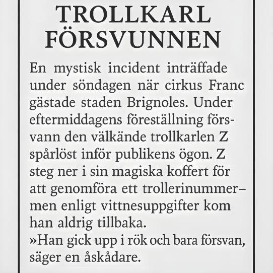 Morfar lästenotisen om ochomigen. TrollkarlenZ.Den magiskakofferten.Brignoles.Allt verkadehänga ihop. Hanlutadesig tillbakamed tidningssidani händerna ochlog tankfullt.
