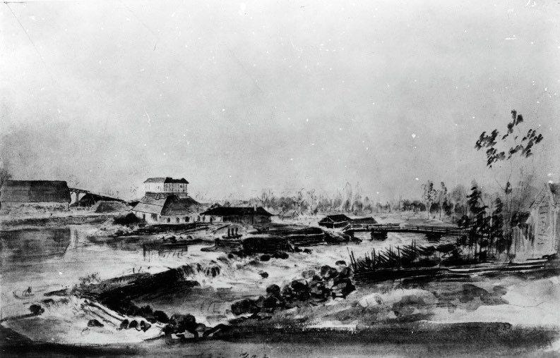 ”UtsiktöverÖnoch masugnen”, Hyttön ca 1794.AkvarellavEliasMartin, 1739-1819.FotoLänsmuseetGävleborg/Jernkontoret. Originalet på Nationalmuseum