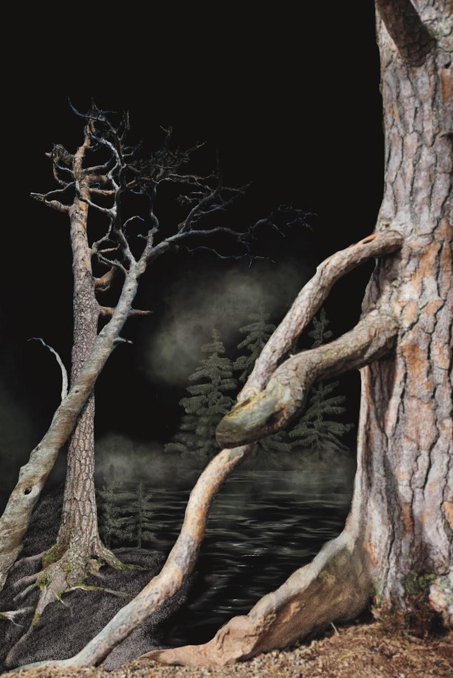 Bildar en högvuxen mur längs vasskanten. Som ålderstigna väktare. Tall och gran. Det knäpper och knakar i deras gamla leder och deras krusiga skuggor dansar i den mörka vattenspegeln. Något bryter ytan. En lom som landar. Den vet att här finns öringar och annat som fått växa sig stora. De är gamla nu. Ingen människa vågar stå och vänta på att de ska nappa och bita tag i betet som förr. Folket som bor i närheten känner olusten krypa i skinnet och håller sig borta numera. En tyst överenskommelse. Det doftar barr och skägglav.