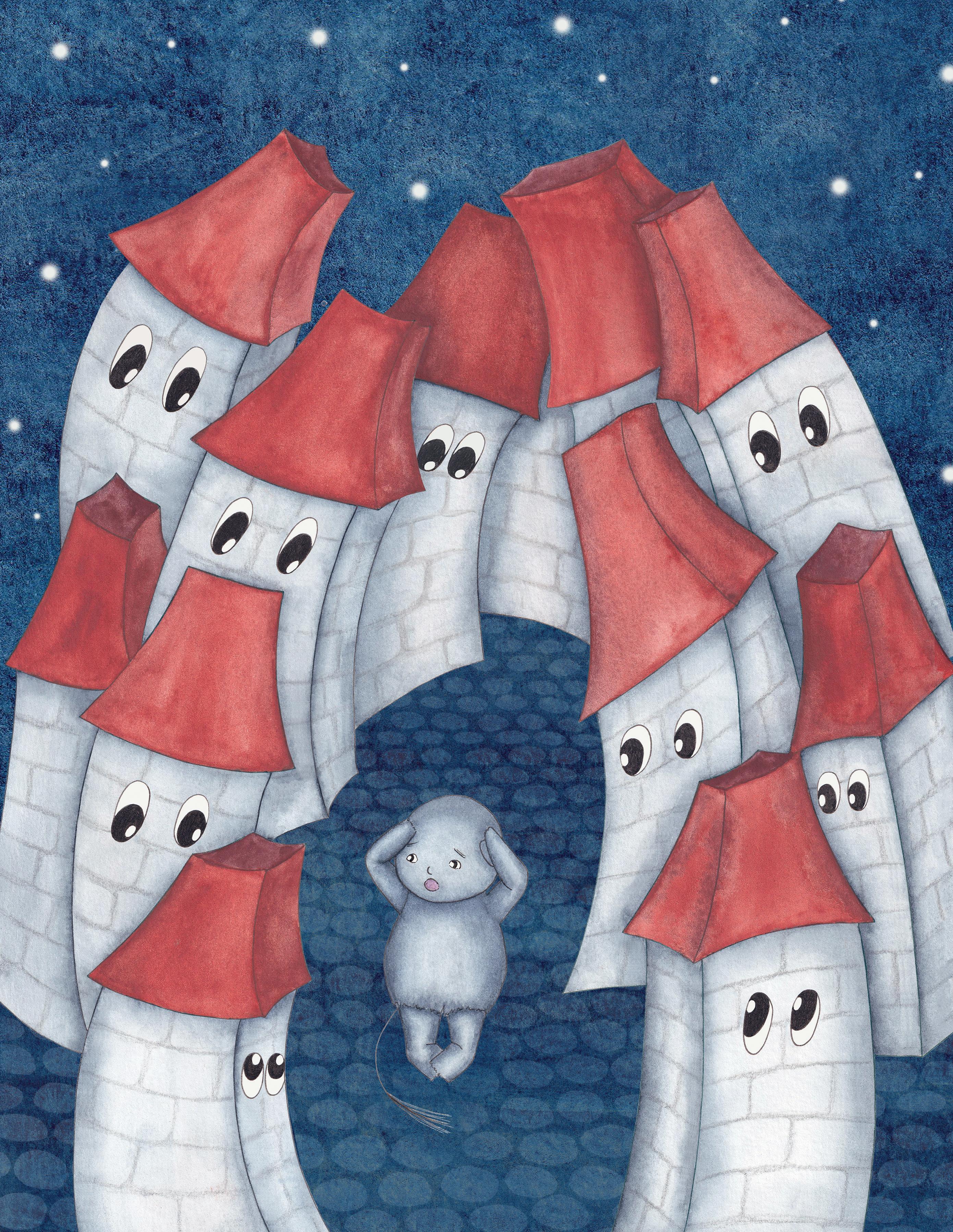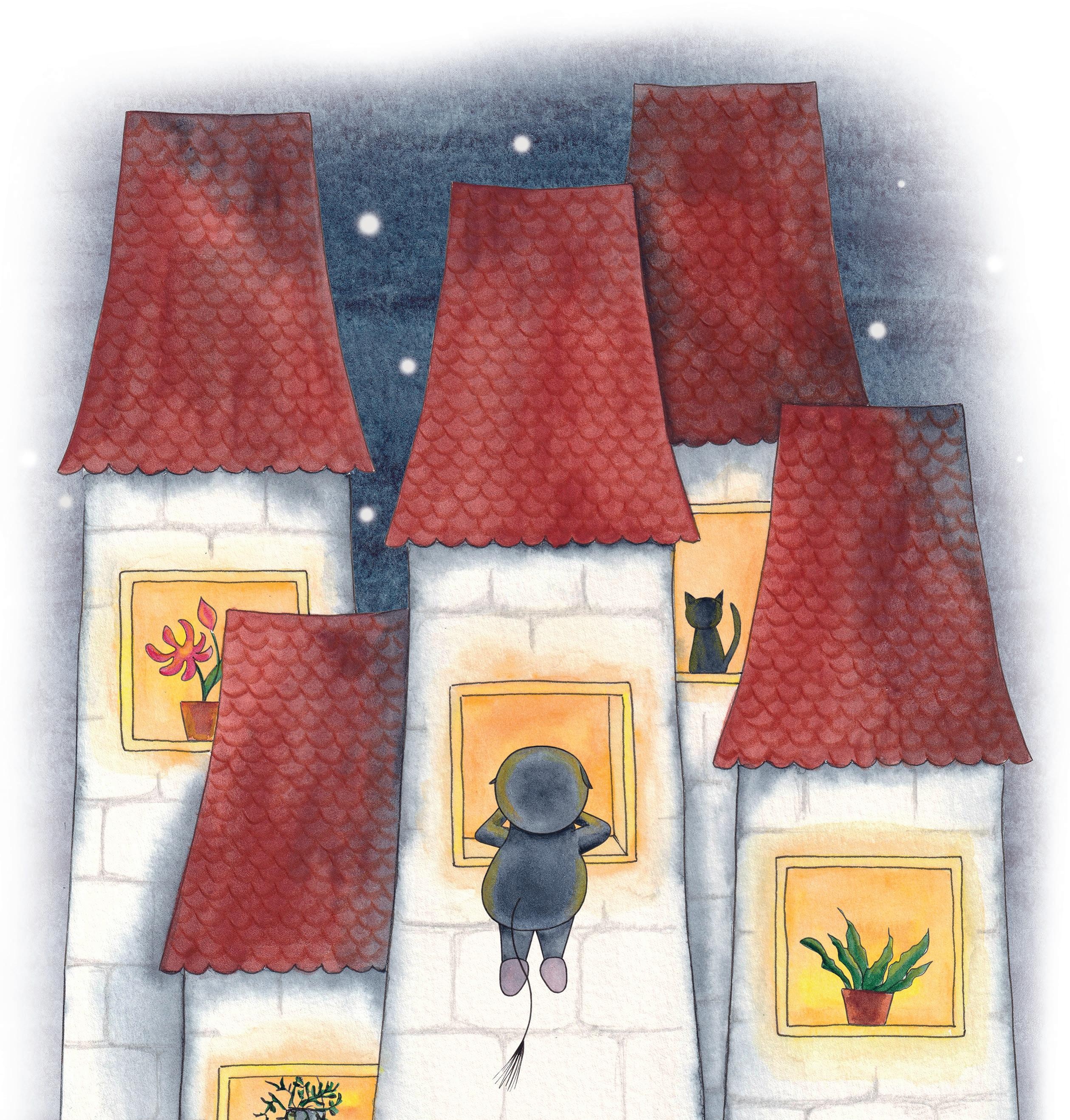 För att komma undan mörkret klättrade monstret in igenom husens upplysta fönster och gömde sig. Men förr eller senare släcktes lamporna och det blev mörkt även där. Då blev monstret skrämd igen och grät.