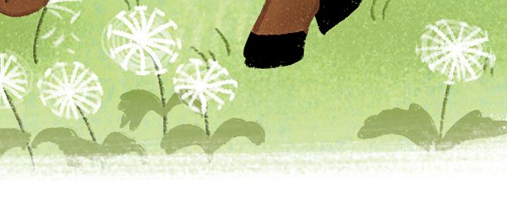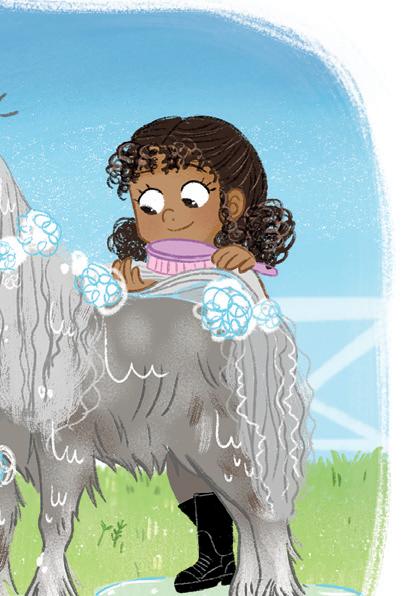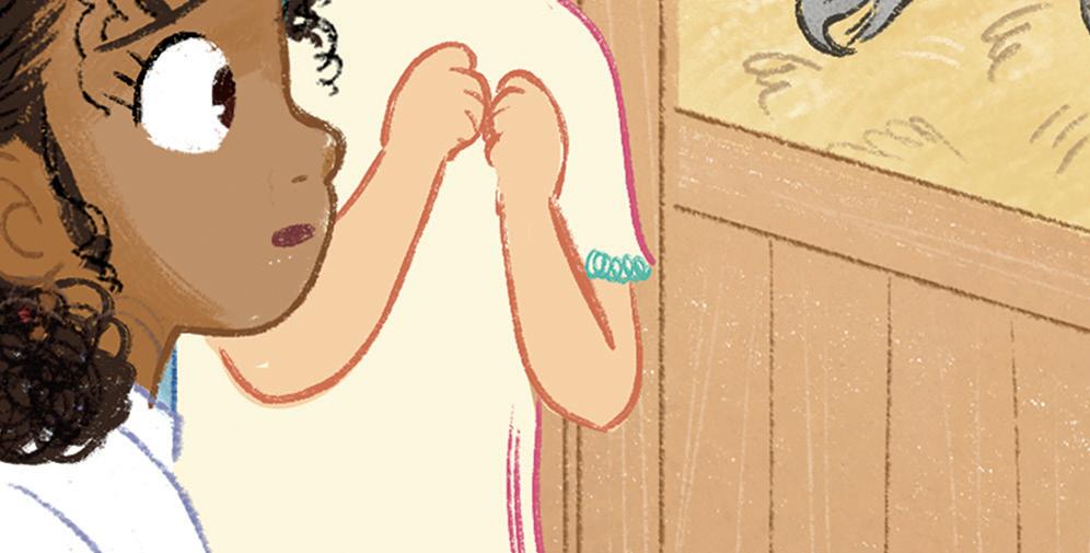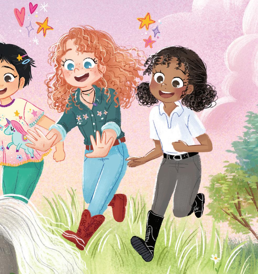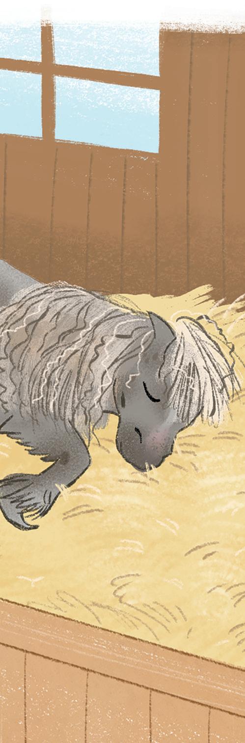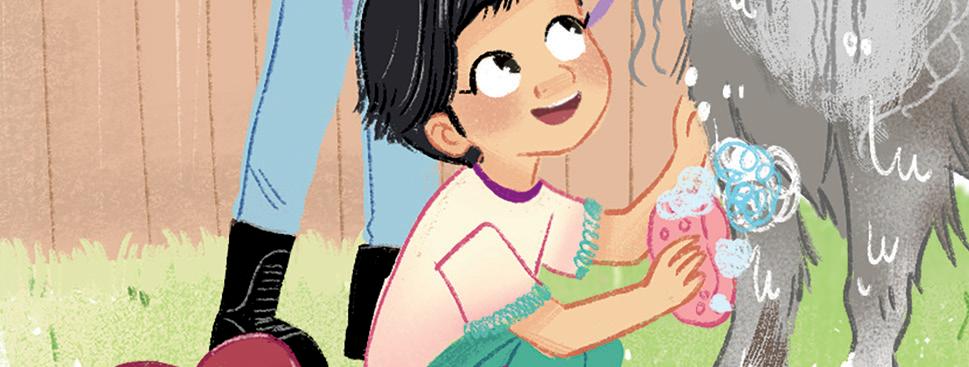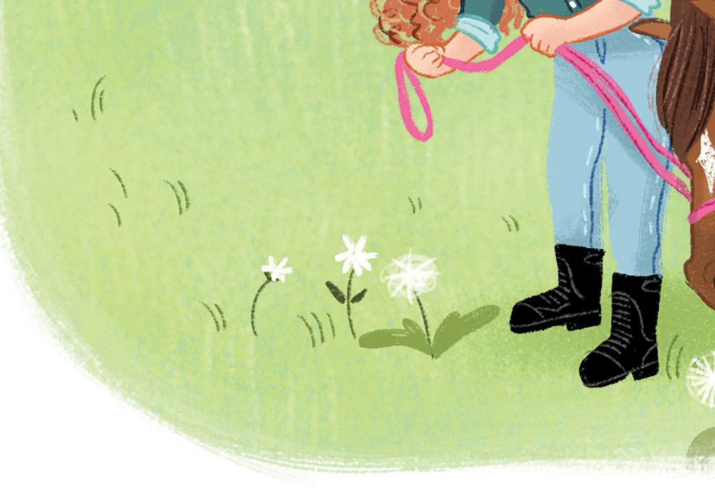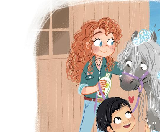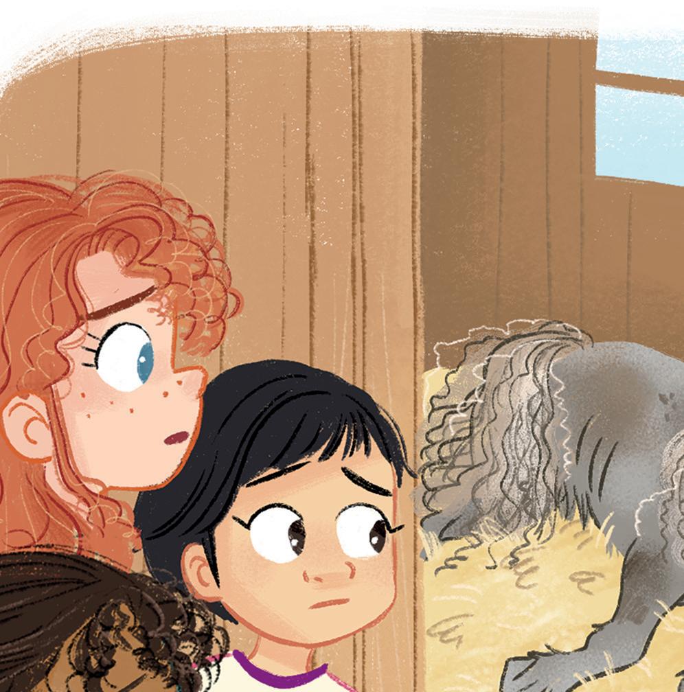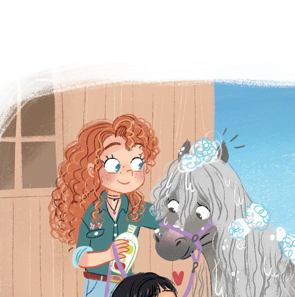 Bess, Daria och Lily tittar på när Rio försiktigt verkar Bönans hovar. Sofie hjälper honom. Bönan är så liten att Rio måste stå på knä för att klippa och raspa de krulliga hovarna. Det är pilligt. Tur att Rio inte bara är stallskötare. Han är en duktig hovslagare också.