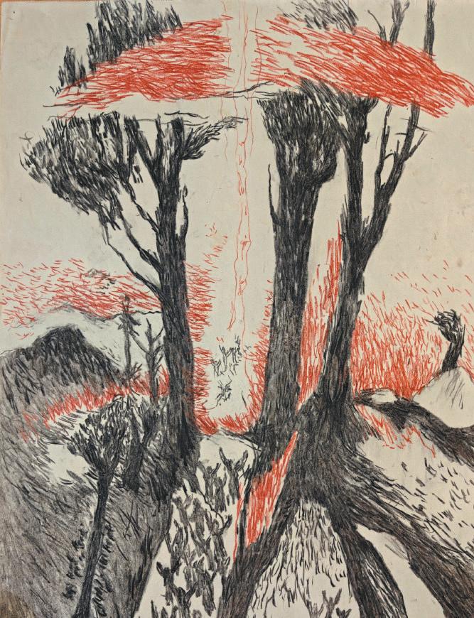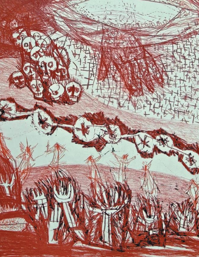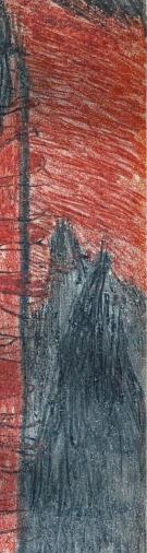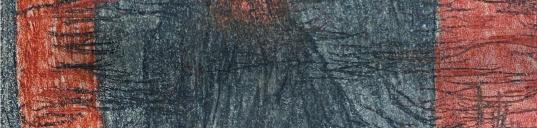 Theinteraction betweenblack andwhite wasaninstrumentfor hisartisticexpression.Asachild he mixedcharcoalfromthe stovewitha fewdrops of rainwater, painting with sensitive fingersinsilky grey shades andpowerfulcoal-blacklines.His love of printmakingwas born from this musicalexperience. He wouldchoosehis technique to suit thesubject:linocutsfor powerful fields balancingeachother;etchingsfor light, depthand saturatedchasms; drypointsgivingmicroscopic variations in line anddark places of concealment; andmonotypes andpaintings offeringcosmicenvironments bathed in colour.