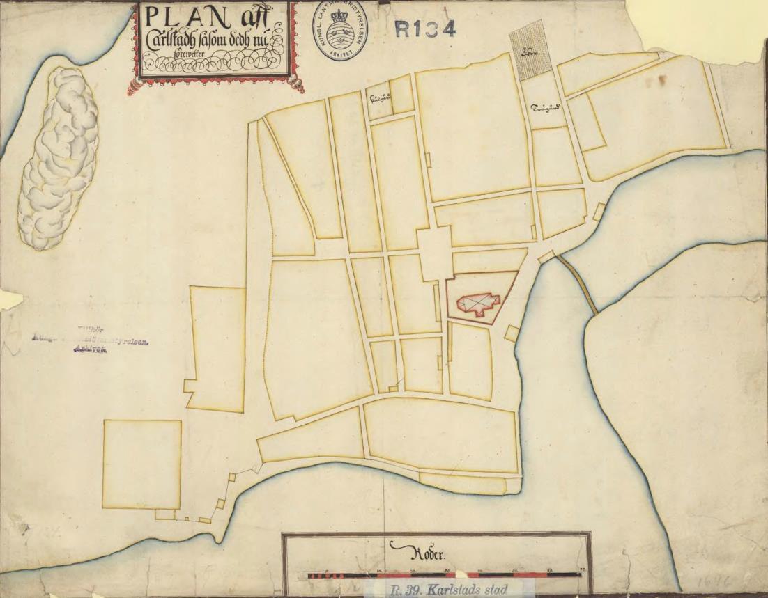 Denäldstakända kartan över Karlstad.Författaren är okänd menkan vara lantmätarenHåkan Arfvidssonsom underden aktuella tidenvar ensamlantmätare iVärmland. Observeraatt kartan är upp-och nedvänd.