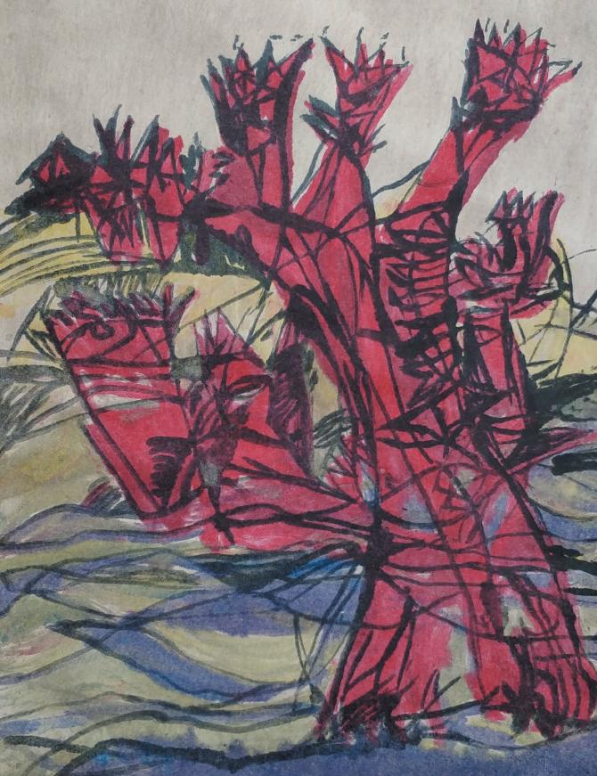 Hanblevtidigtförälskad imonotypien. Dennatekniksom kombinerar måleriets ochgrafikens båda unikamöjligheter.Med nattensupplevelser fortfarandelevande somvibrationer ihansinremåladehan på glasskivan ochgjordeett uniktavdrag. För detmesta ifärg, menredan tidigt isin karriärsom monotypiensmästare skapadehan ocksåsvart-vitamonotypier.