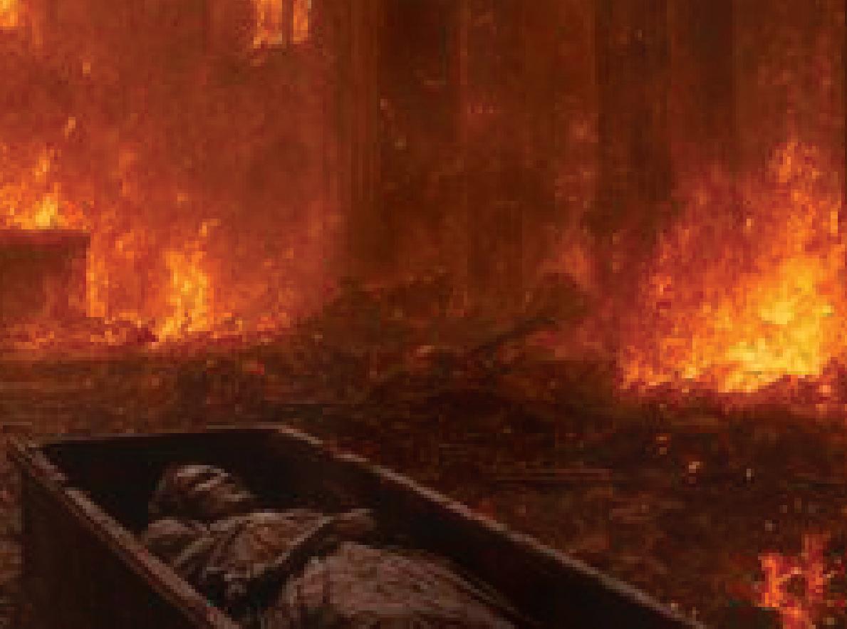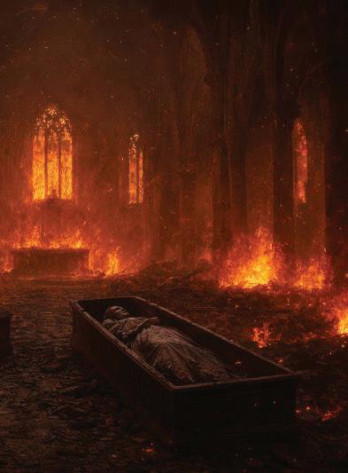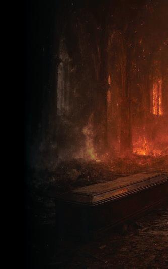 Omfamnadavmörkret bröt sigtankarna fram.Varförliggerjag här? Varärjag?Varför ligger jaghär imörkret?Ärjag kanske dödoch varför kommer jaginteihågnågonting? Mednya krafter lyckades hanlyftaarmen rakt uppännuengång. Locket, ellerovandelen, gnisslade lite mindre dennagångtyckte han. Jagärnog inomhus, tänkte han, iett kalt ruminsveptidenna märkliga smutsguladimma.För en stundtrodde hanatt hans sista stundvar kommen.Eller varden redandet?Han sågsvaga konturer av en altargång medtomma stolar längssidorna.Devar delvissvarta, sotiga,som svedda av eldslågor. Hanlade sig neroch då blev allt åter tyst,mörkt ochkallt.