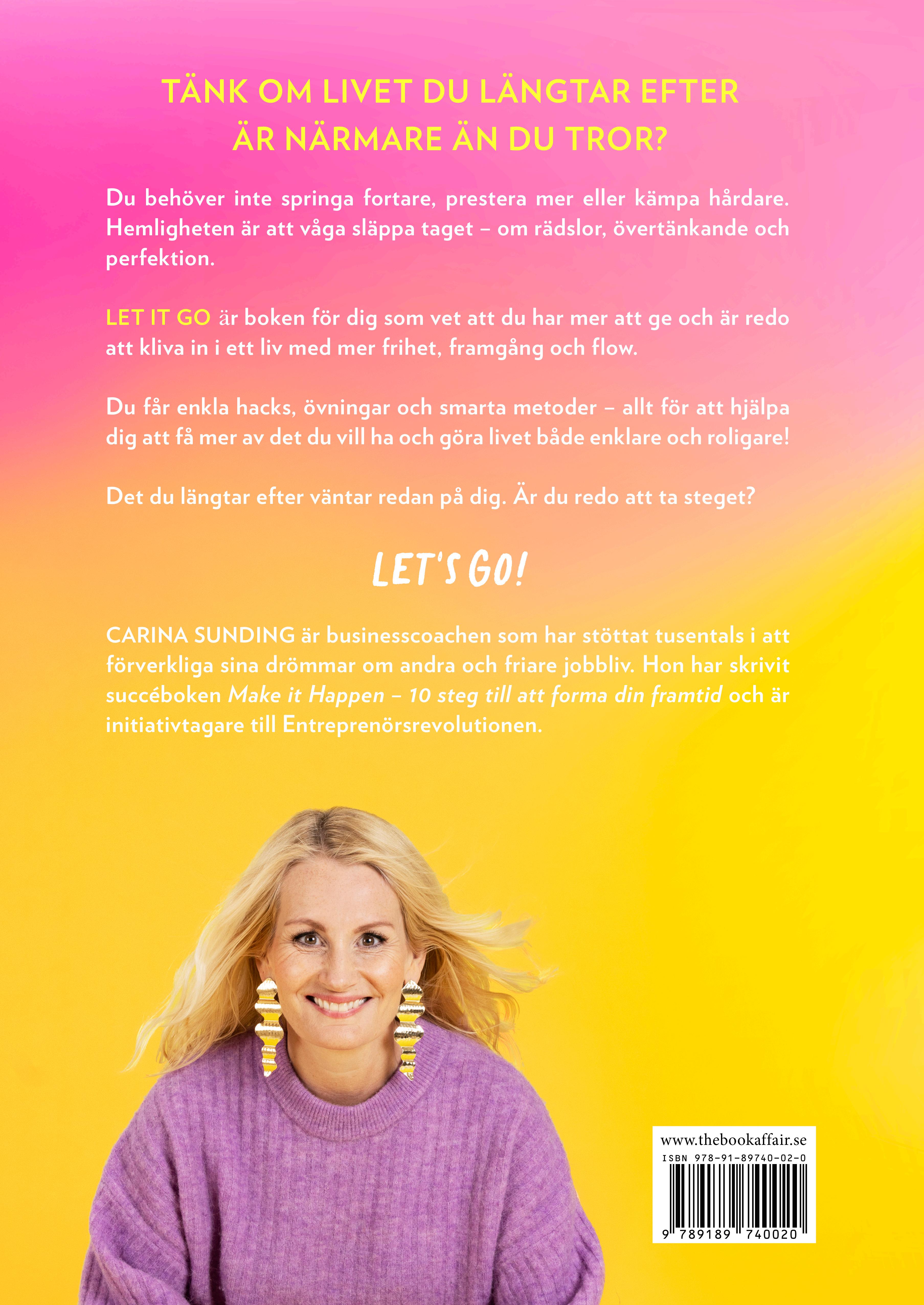 Let it go Àr en bok för dig som Àr redo att slÀppa taget om det som hÄller dig tillbaka. För dig som lÀngtar efter mer frihet. Som vet att du har mer att ge och vill hitta din grej. à tta mentala metoder för dig som vill lyfta fram mer av din potential, för dig som vill tÀnka och drömma större och leva livet fullt ut. En bok för dig som kÀnner dig fÀrdig med att kÀmpa, Àr trött pÄ att vara rÀdd eller pÄ att försöka ha koll pÄ precis allt. Det Àr precis till dig jag har skrivit den hÀr boken. Och ja, lika mycket till mig sjÀlv. För jag vill att vi ska kliva fram och ta för oss av livet och alla vÄra möjligheter i stora tuggor. LET'S GO