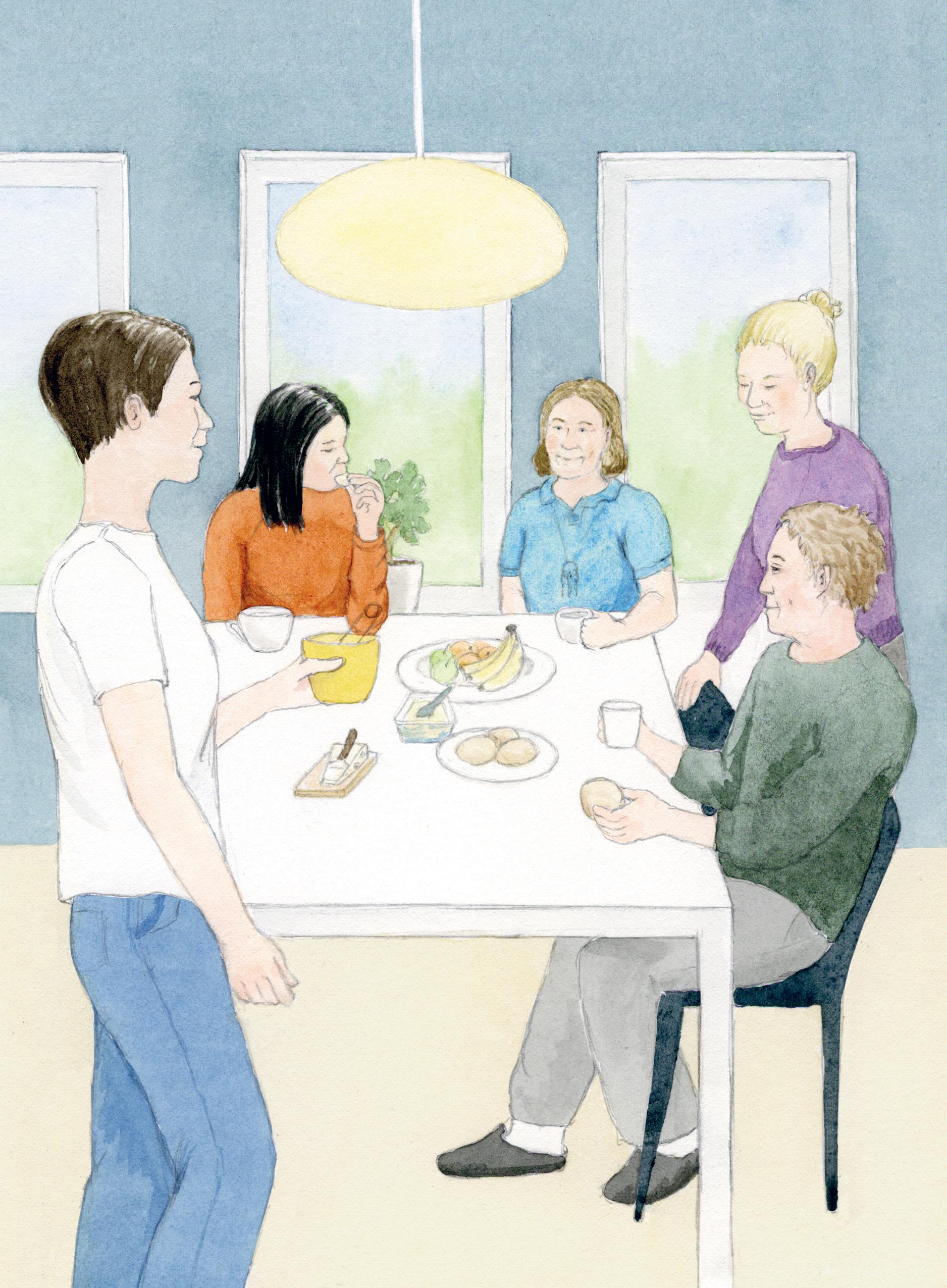 – Frukosten är klar! ropar Sara som jobbar på boendet.