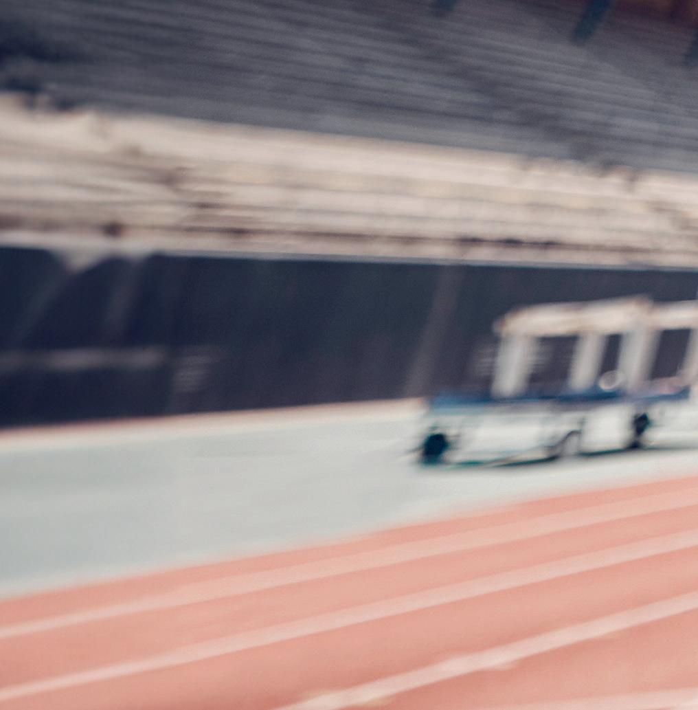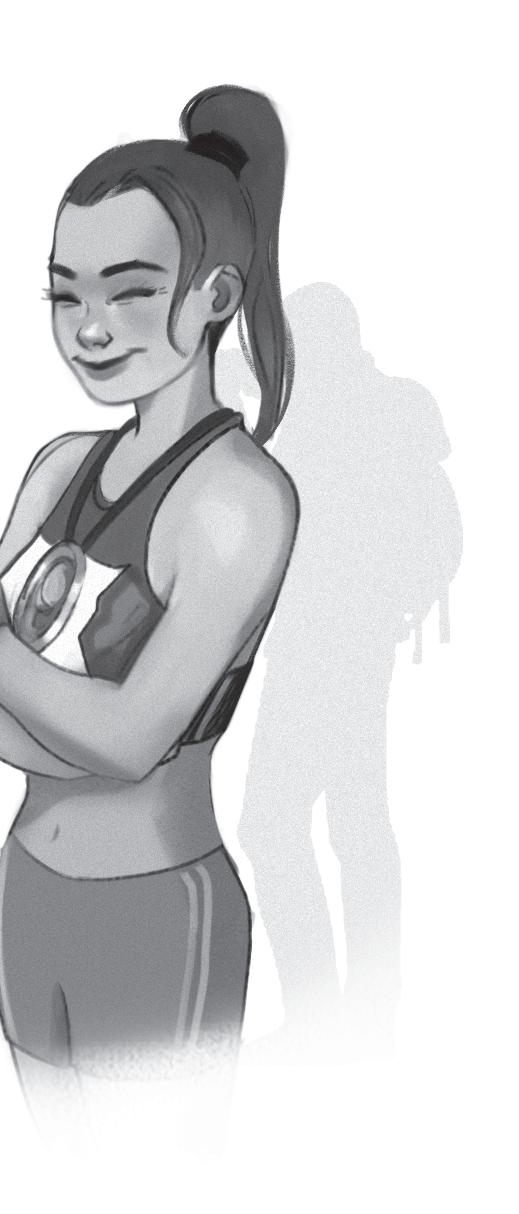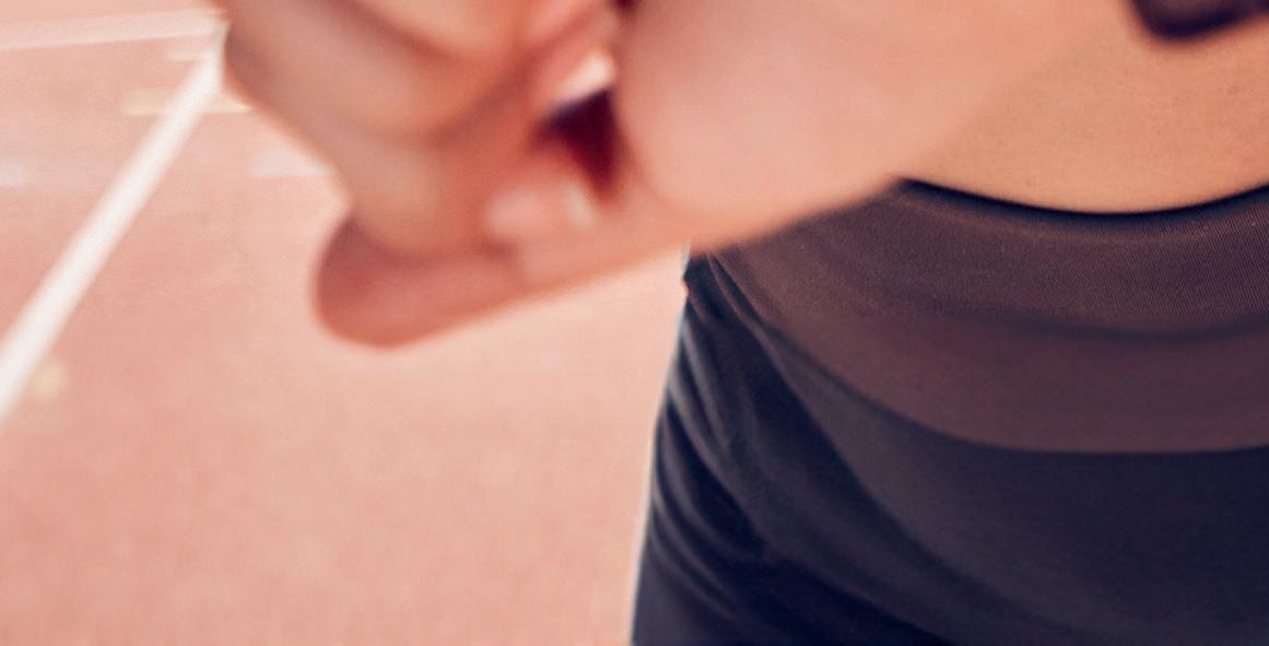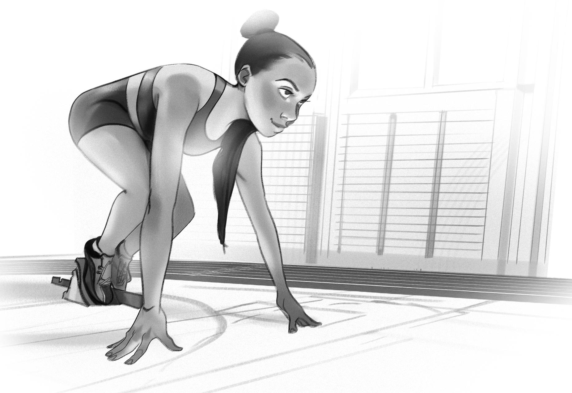 Hon griper tag med fingrarna i löparbanans slitna gummi-underlag. Sedan höjer hon blicken. Trycker ifrån med händerna och lyfter kroppen. Redo att sticka iväg.