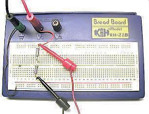 Nu kompletterar vi experimentkretsen med en lysdiod och en strömbegränsande serieresistor för att få en till-och-från-indikator.