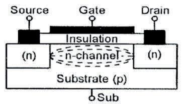 Även enhancement-MOSFET har en isolerad Gate, men är annorlunda genom att den saknar N-kanal mellan Drain och Source. En N-kanal bildas i P-substratet först då G ges en positiv spänning relativt S.