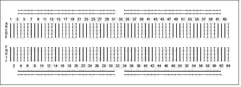 Alla hål som är förbundna med en linje är en kopplingspunkt, t ex rad 1 (ABCDE). Rad 1 (FGHIJ) är en annan helt separat kopplingspunkt.