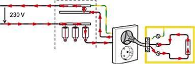 Var och en av de tre fasspänningarna på 230V kan kopplas via en säkring till enfasuttag. Lägg märke till hur den inkommande PENledaren delas i PE- och N-ledare i säkringscentralen och hur de är anslutna till enfasuttaget.